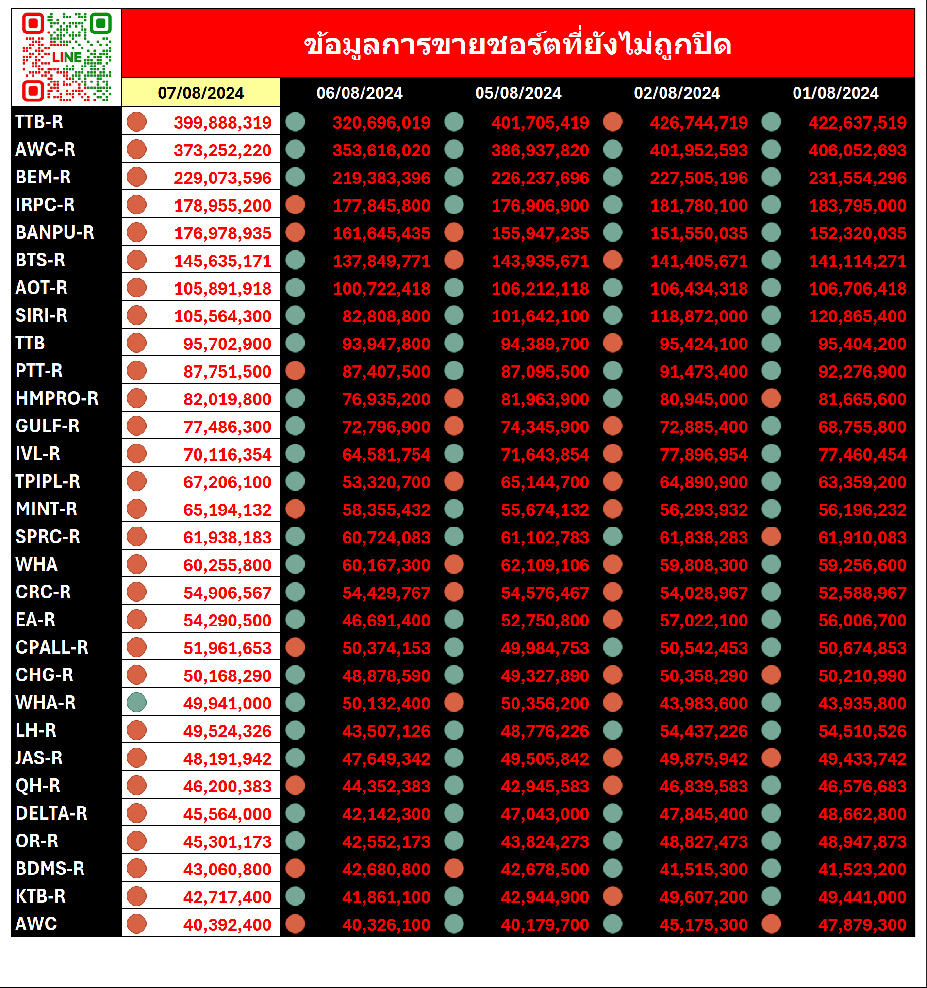 🔴🔴30อันดับ Short Sale ที่ยังไม่ได้ปิด🔴🔴📅 7/8/2024