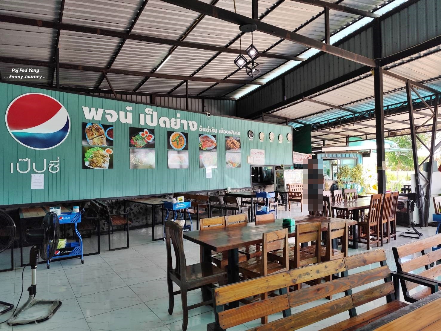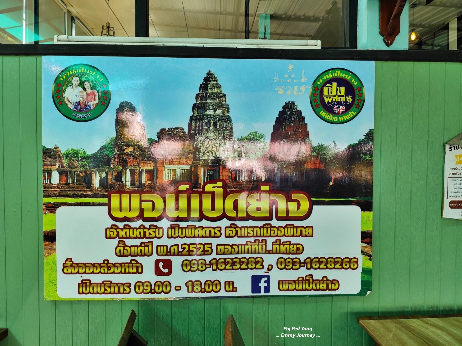 ร้านพจน์เป็ดย่างเจ้าต้นตำรับ เจ้าแรกของเมืองพิมายตั้งแต่ปี 2525 ก่อตั้งโดยคุณตาพจน์ แต่เดิมร้านตั้งอยู่ในตัวเมืองพิมายใกล้กับธนาคารออมสิน และย้ายออกมาชานเมืองซึ่งเป็นที่ตั้ง ณ ปัจจุบันตั้งแต่ปี 2539 เป็นต้นมา ในอดีตเป็ดย่างที่ร้านเป็นเป็ดไทย ย่างแห้งกรอบ ตามสูตรคุณตาพจน์ และปัจจุบันมีเป็ดปักกิ่งตัวใหญ่ เนื้อเยอะ ไว้เป็นอีกหนึ่งทางเลือกสำหรับลูกค้า อาหารขึ้นชื่อทางร้าน ได้แก่ เป็ดย่าง ไส้เป็ดทอด ตูดเป็ดย่าง ลาบเป็ด ต้มแซ่บกระดูกหมูอ่อน ผัดเผ็ดพวงไข่อ่อน เป็นต้น เป็ดย่างร้านเราใช้เป็ดสดจากฟาร์มที่ได้มาตรฐาน (ขอบคุณข้อความจากร้านพจน์เป็ดย่าง)