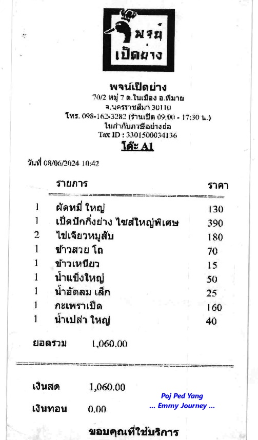 ต้นเดือนมิถุนายน 2567 ครอบครัวเรามีแผนไปเยี่ยมลุงกับป้าที่จังหวัดอุดรธานี ขับรถผ่านโคราช พอถึงมื้อกลางวันเลยแวะทานที่ร้านนี้ เขาบอกว่าร้านนี้เป็นเป็ดย่างต้นตำรับเจ้าแรกของอำเภอพิมาย (เราก็เพิ่งมาทานครั้งแรก ก็เลยไม่รู้นะว่ารสชาติอาหารของร้านนี้สมัยก่อนจะอร่อยแค่ไหน)