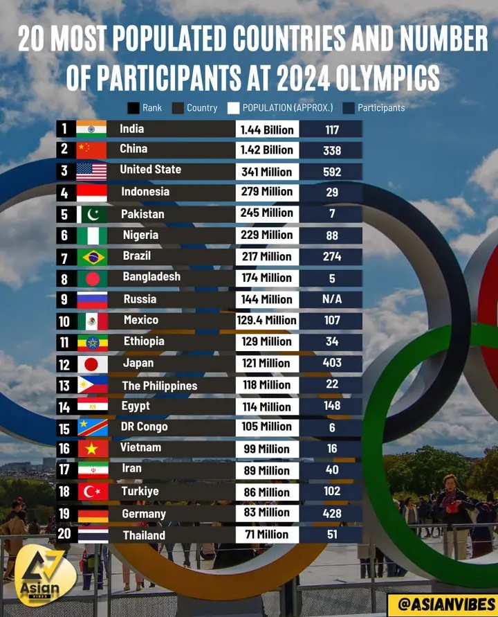 Top 20 ชาติที่มีประชากรมากสุดในโลก + จํานวนนักกีฬาที่ผ่านคัดเลือกมาปารีสโอลิมปิก