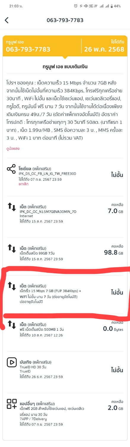 รบกวนทาง TrueMove ยกเลิกโปรโมชั่นแพ็คเกจที่ต่ออายุอัตโนมัติที่วงกลมสีแดงของเบอร์ 063-793-7783 ให้หน่อยค่ะเพราะรู้สึกว่าเปลืองเงินและเล่นเน็ตไม่ได้เลยซื้อแพ็คเกจเสริมอย่างอื่นก็เล่นไม่ได้เนื่องจากติดความเร็วของโปรโมชั่นน่ารำคาญมากค่ะ