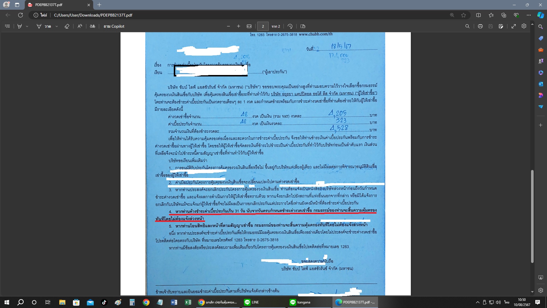 บริษัทขับบ์ ไลฟ์ แอสชัวรันซ์ บอกว่ายังยกเลิกไม่ได้ต้องผ่อนงวดไป เดือนที่ 3-4 ก่อนถึงทำได้ ( กรณี ในบันทึกที่ผมเซ็นวันทำสัญญาขอประกันไม่มีในเอกสาร ในเอกสาร ข้อที่ 4 ระบุ หากท่านค้างชำระเบี้ยประกัน 31 วัน กรมธรรม์ของท่านจะสิ้นสุดลด) ทางตัวแทนประกันกลับตอบว่ามันมีในใบกรมธรรม์ ที่เขาส่งมาทางบ้านที่อยู่