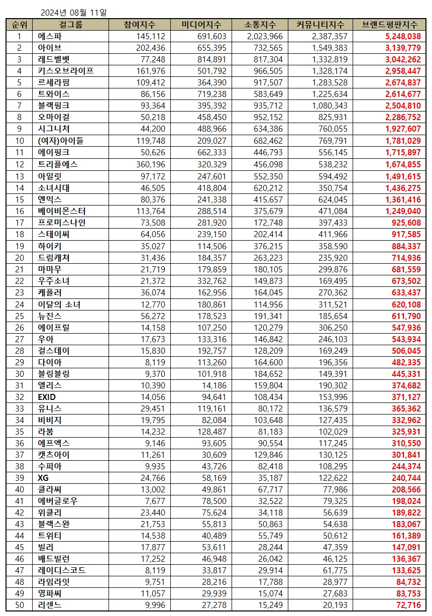 Top 50 K-Pop Girl Group Brand Reputation Rankings in August 2024