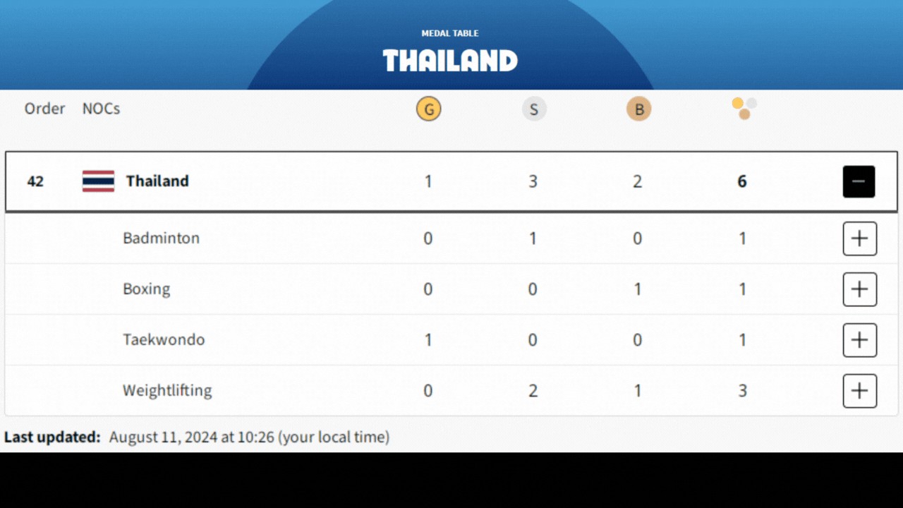 อัปเดตเหรียญรางวัลโอลิมปิก ปารีส 2024 ของทีมชาติไทย