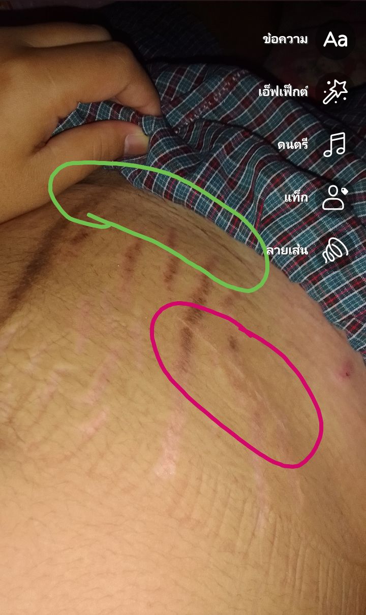 พึ่งผ่าคลอดมาค่ะ แต่แผลผ่าคลอดหายปกติดีไม่เจ็บ(วงสีเขียว) แต่รอยแตกขณะตั้งครรภ์ซึ่งเกิดทับตรงรอยแผลผ่าตัดเก่า(ใส้ติ่งเมื่อ9ปีที่แล้ววงสีชมพู)พอดี เวลาลุกคือเจ็บมากๆ เจ็บเหมือนเนื้อจะฉีก เช็คมั่นใจแล้วค่ะว่าเจ็บที่รอยแตกแน่ๆไม่ใช่แผลผ่าคลอด ทำยังไงดีคะ เวลาลุกอุ้มลูกเจ็บจี๊ดทรมานมาก