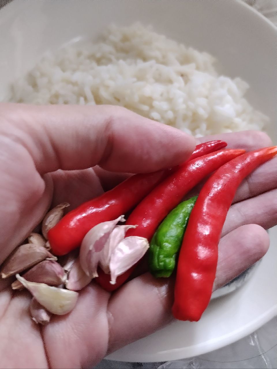 หลังจากที่ป่วยอยู่หลายวัน ก็เลยไม่ได้ไปตลาด จขกท.ก็เลยไปควานหาดู ว่ามีอะไรพอเหลือ ทำกับข้าวได้บ้าง เจอข้าวสวยที่แช่ตู้เย็นไว้ ลูกชิ้นหมูอยู่ 1 ถุง ผักอะไรก็ไม่มี กระเทียมหมด เหลือแต่กระเทียมโทน อยู่นิ