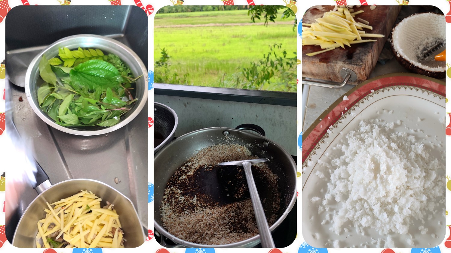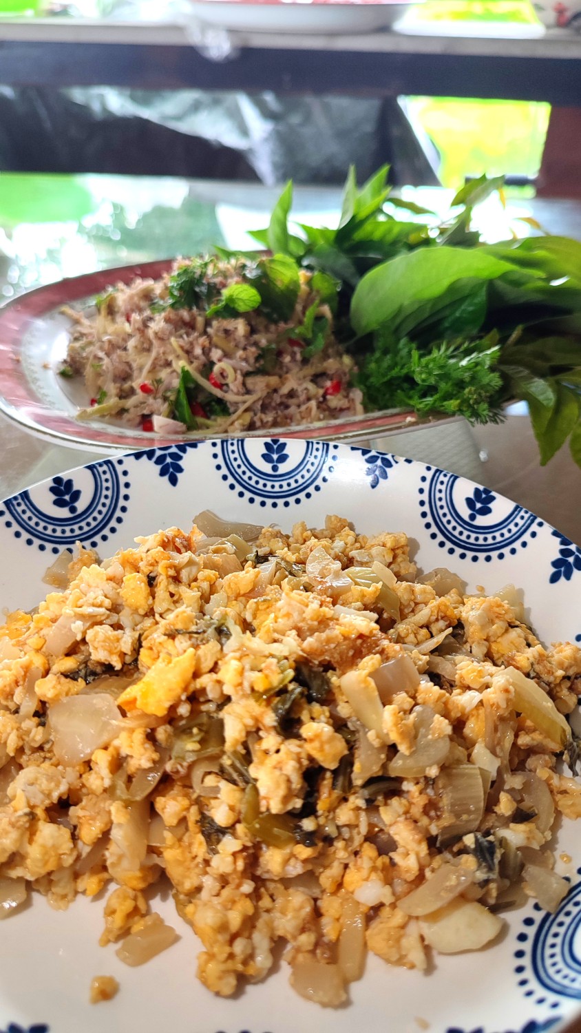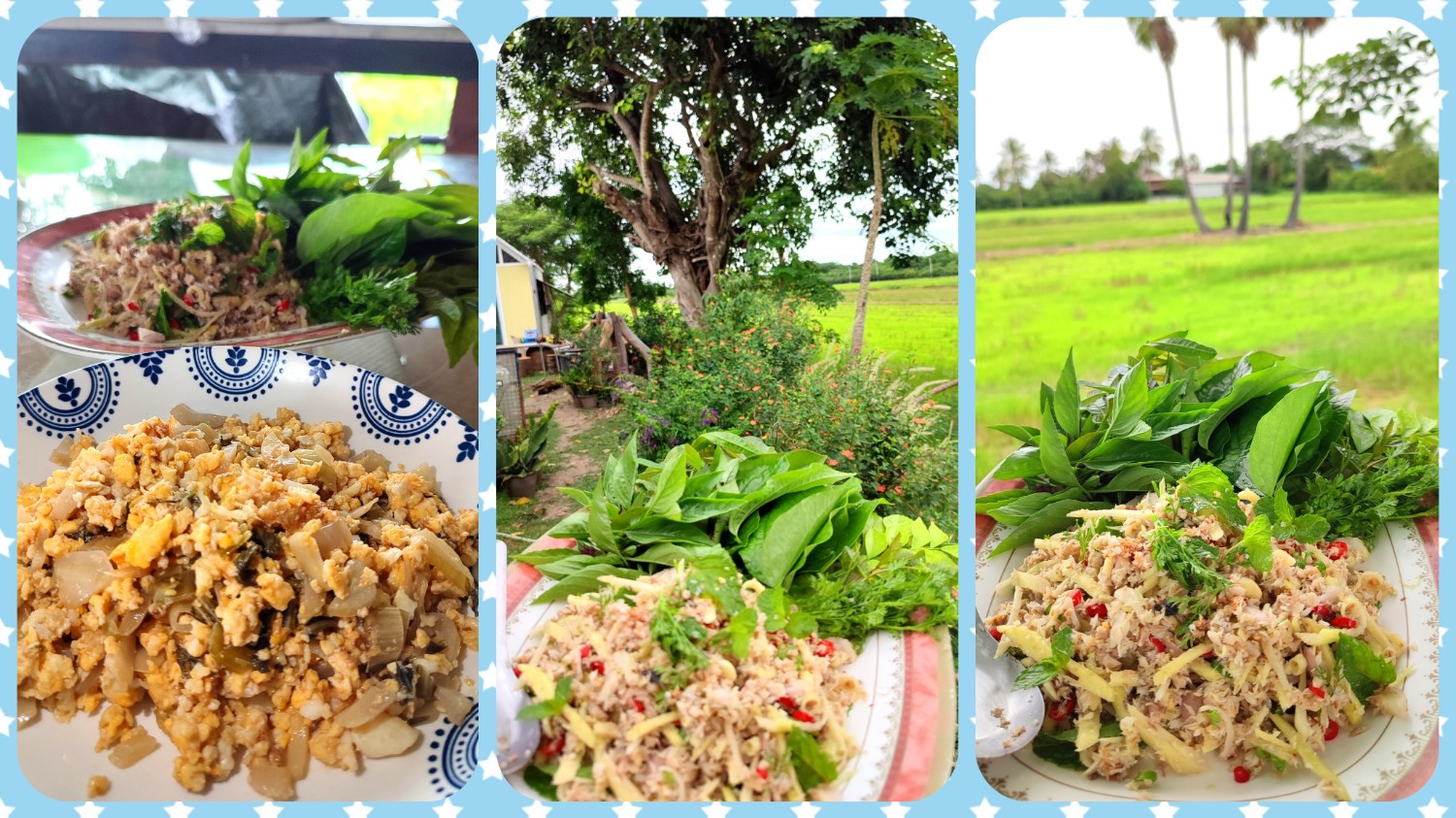 วันนี้ที่โคกหนองนามีมะพร้าวร่วง แม่ครัวเห็นเข้าเลยมีไอเดียอยู่ 2 รายการก็คือขนมตาลกับยำปลาทูแต่ขนมตาลเพิ่งทำเมื่อไม่กี่วัน วันนี้ก็เลยจัดการทำเป็นกับข้าวยำปลาทูกับผักกาดดองผัดไข่ เพราะว่ายำปลาทูนั้นต้องเอามะพร้าวขูดไปคั่วไฟด้วยครับ ทานคู่กับใบชะพลู,โหระพา,ผักชี,มะตูมบาเรน,ใบคะนิว,ยอดชะมวง วันนี้กับข้าวติดคอหน่อยครับไม่มีน้ำเลย