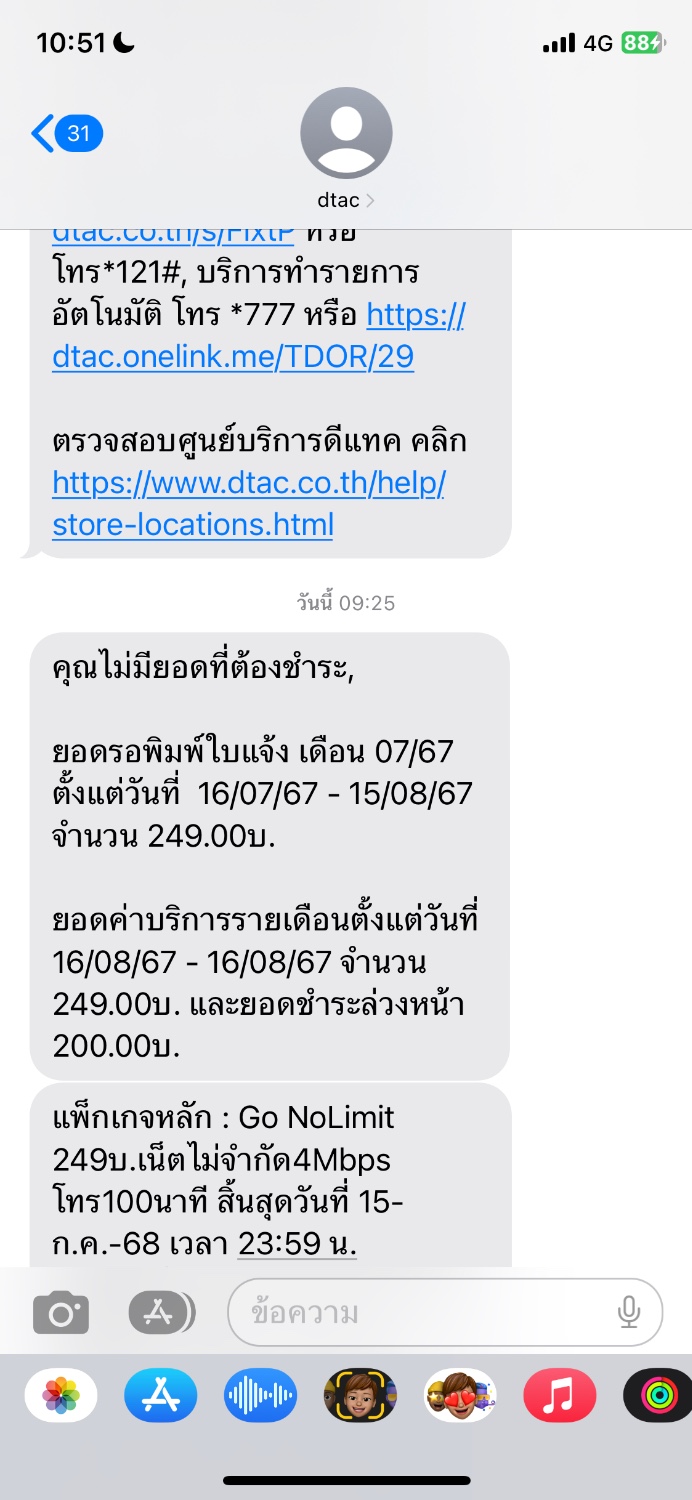 มี sms true แจ้งให้เติมเงิน 30 /9/68 แพคเกจ เน็ตไม่อั้น 4Mbps +Wifi+โทรฟรี ทุกเครือข่าย นาน 30 เมื่อเช้าเติมเงินเข้าไปแล้ว แต่ระบบไม่หักยอดเงิน ทำให้ใช้บริการแพคเกจนี้ไม่ได้ และช่วยยกเลิก บริการข้อคว