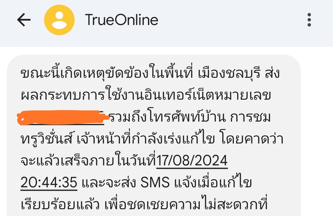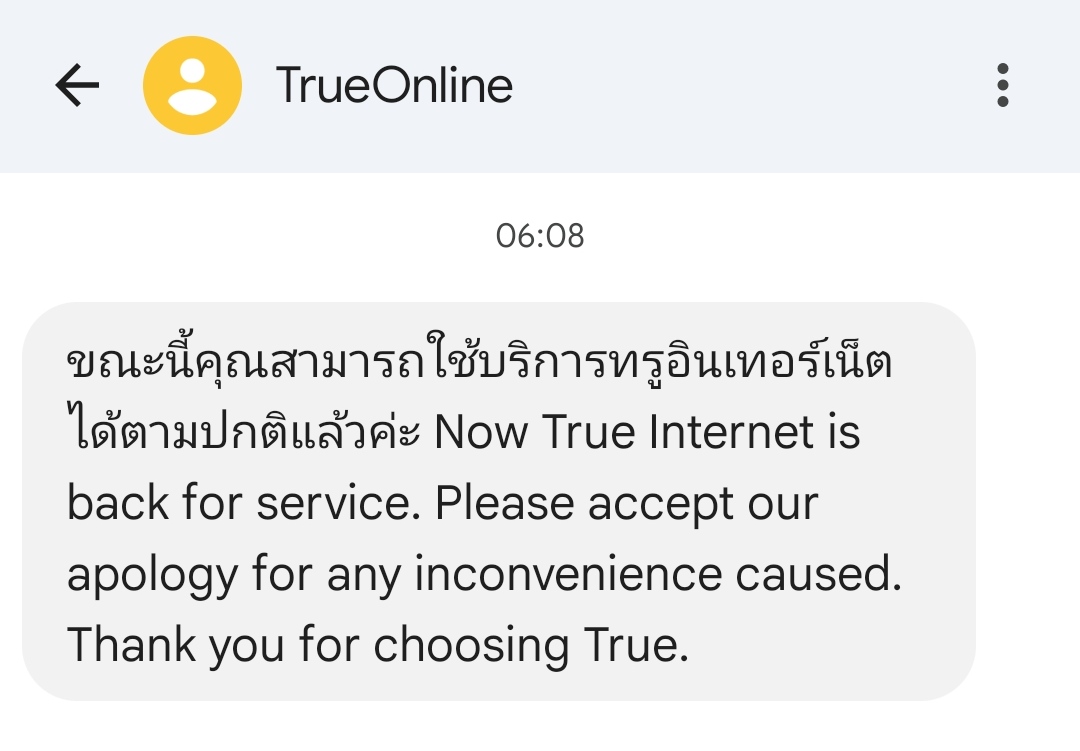 เรื่องเก่ายังไม่หายดี เน็ต+TV ล่มไป 2 วัน พึ่งจะมี SMS แจ้งว่าใช้ได้เมื่อเช้าตอน 6 โมง ใช้ได้แค่ไม่กี่ชั่วโมง 11.45 น. ระบบล่มอีกแล้ว อะไรของพวกคุณครับ ค่าซื้อแพคเน็ตเสริมในบ้านผมเนี่ยระหว่างที่ล่มแล้วต้องทำงานรวมๆกันที่ผ่านมานี่จ่ายค่าเน็ตบ้านได้หลายเดือนแล้วนะครับ เดือนกว่าๆล่ม 6 รอบแล้วนะครับ แต่ละรอบล่มเป็นวันด้วยยิ่งรอบก่อนล่ม 2 วันเต็มๆ