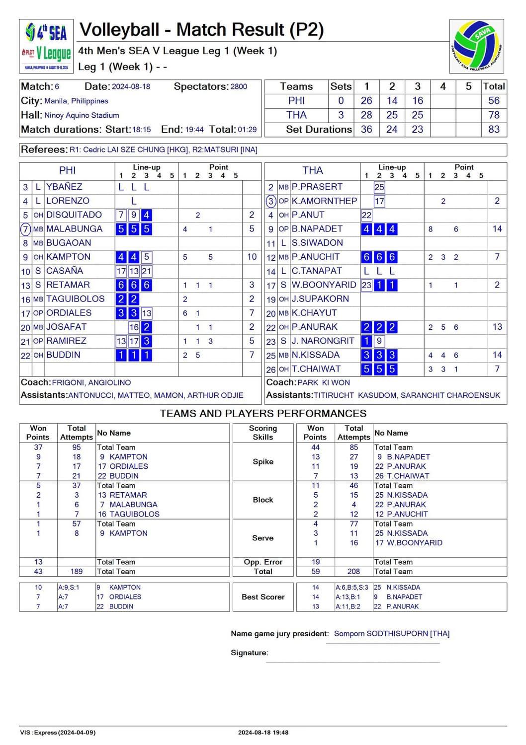 Score card วอลเลย์บอลชาย ไทย เจอ ฟิลิปปินส์