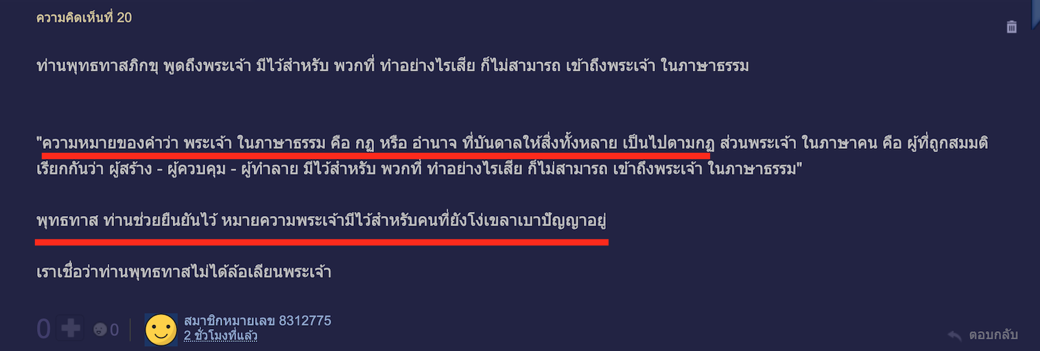 เนื่องจากผมรู้จักท่านพุทธทาสมาเป็นเวลานานมากๆ ตั้งแต่บางคนในที่นี้ยังไม่เกิด เมื่อผมเห็นประโยคที่ผมขึดเส้นแดงไว้ ทั้งสองประโยค ผมเห็นว่าเป็นเรื่องเหลือเชื่อที่ท่านพุทธทาส จะใช้วาจาเช่นนั้นในการสอนธรรมของพระพุทธองค์ ผมจึงไปอ่านหนังสือของท่านพุทธทาสเรื่อง "ภาษาคน - ภาษาธรรม" ซึ่งมีประมาณ 66 หน้า แต่ก็ไม่พบข้อความหรือการอุปมาดังกล่าวที่เกี่ยวกับ "พระเจ้า" ที่คริสเตียนและมุสลิมนับถือ