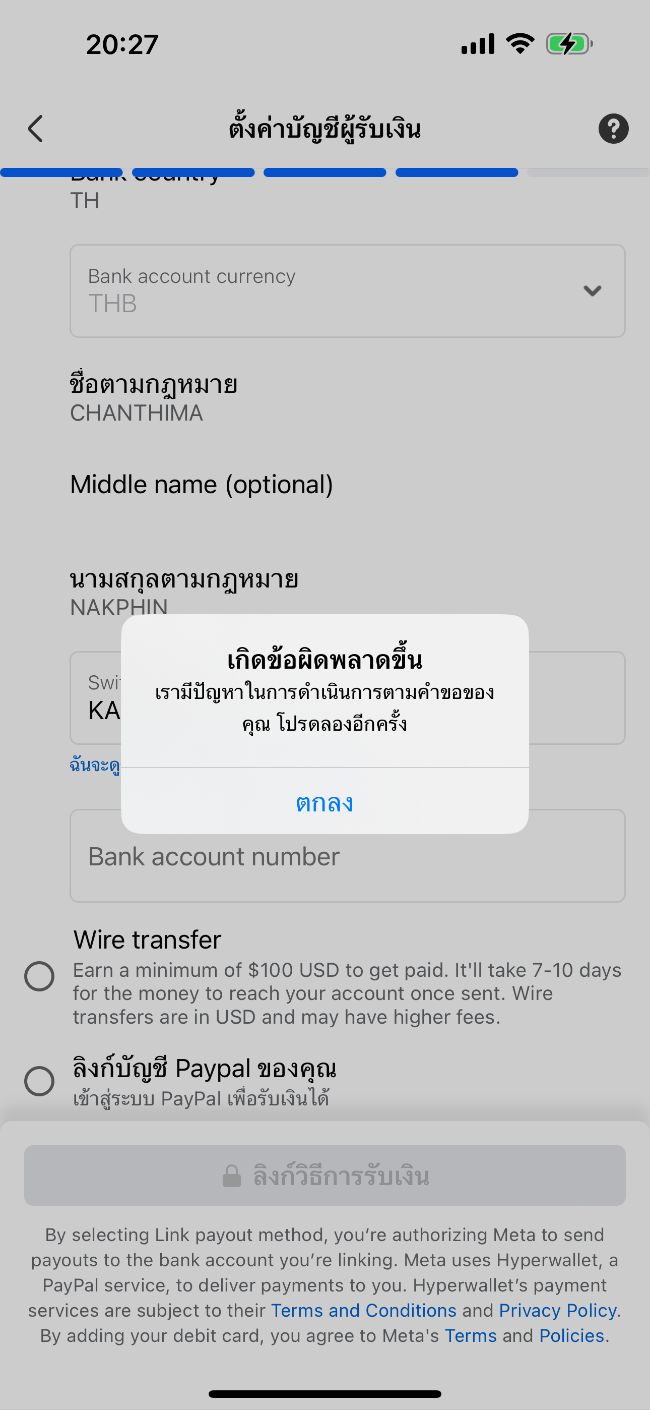 FB ตั้งค่าบัญชีรับเงินไม่ได้ค่ะ ใครมีวิธีแก้บ้างคะ ลองหลายครั้งมาก ข้อมูลถูกทุกอย่างค่ะ