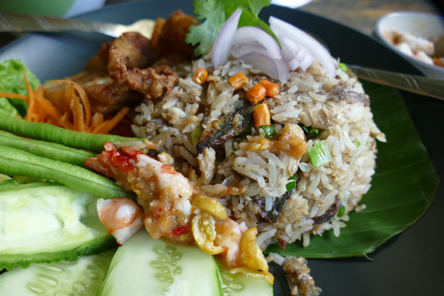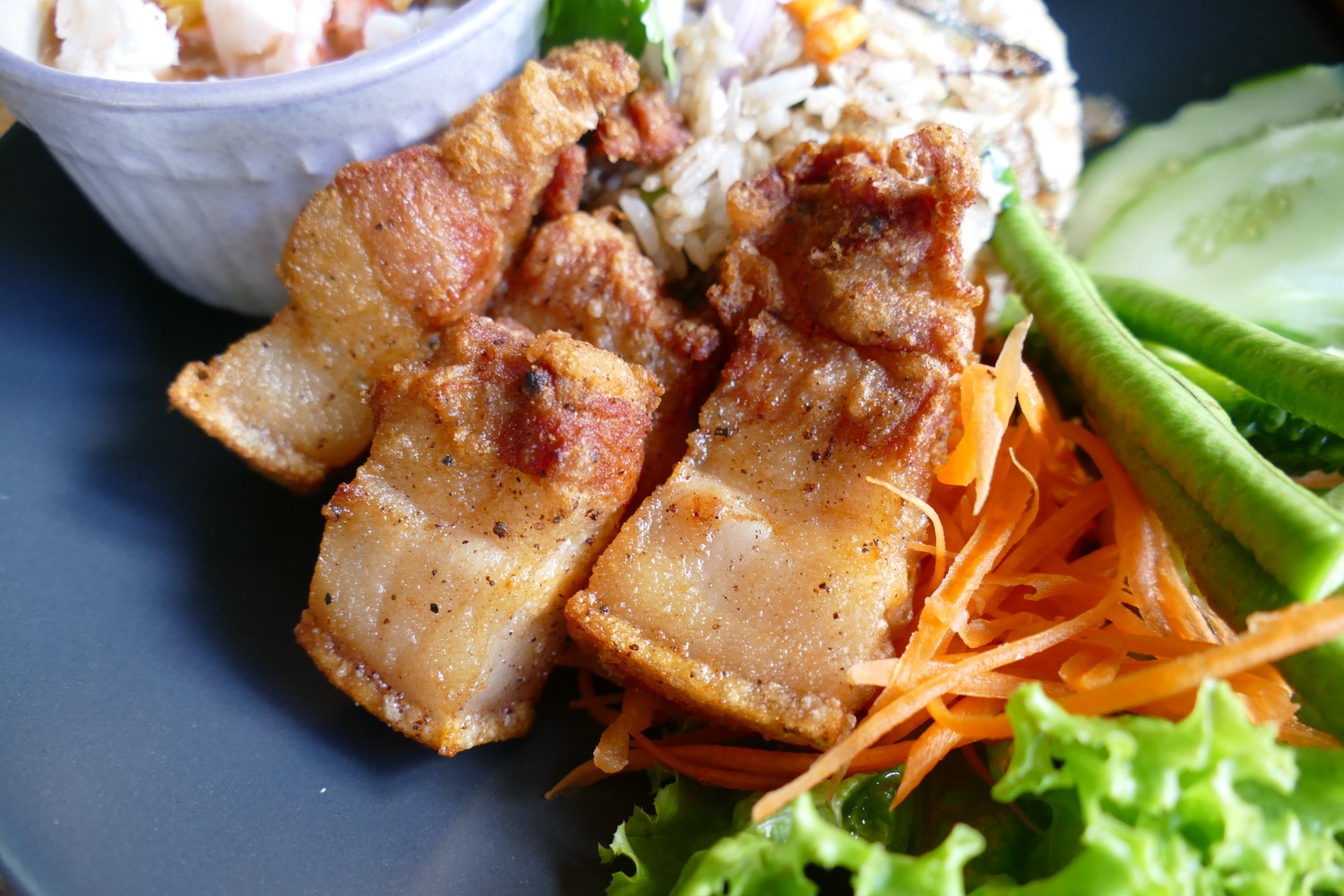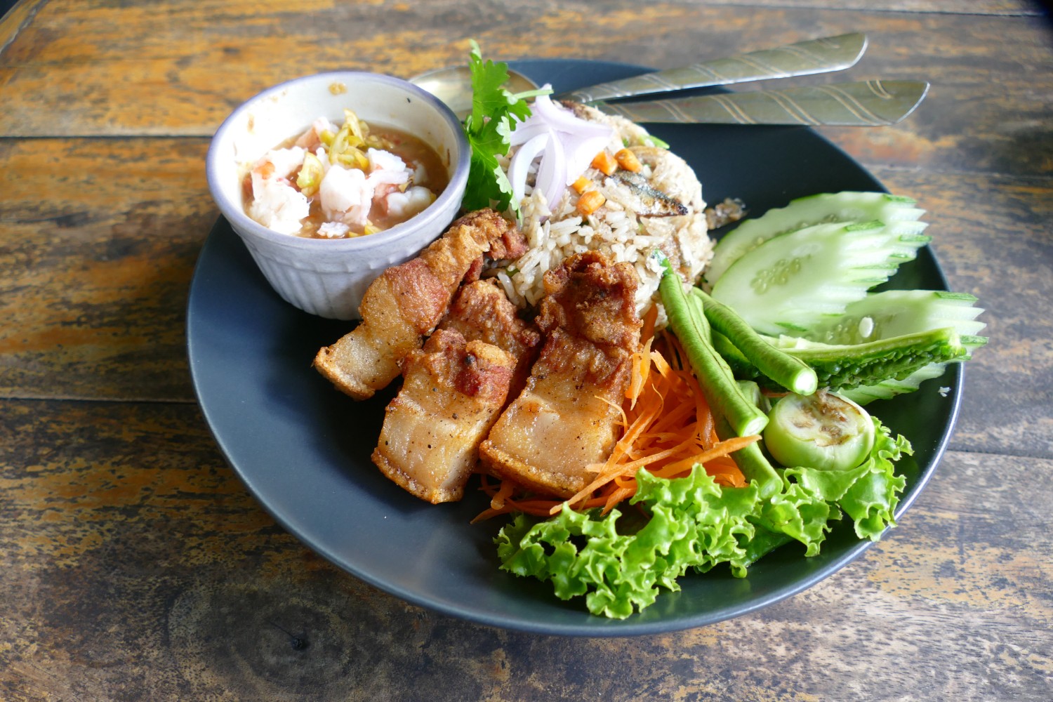 ข้าวผัดน้ำพริก กับสามชั้นทอด กับแกงเลียงกุ้งสด
