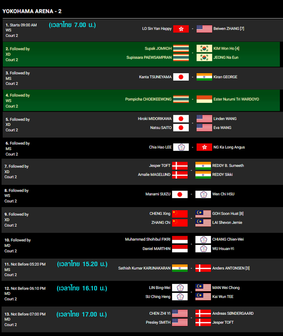 • Youtube BWF TV [Non TV Court] [Court 1] [Match 11-14] (คู่แรก 17.00 น.) :