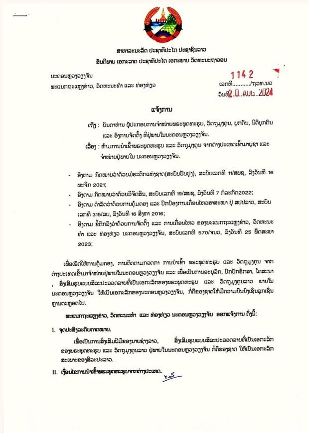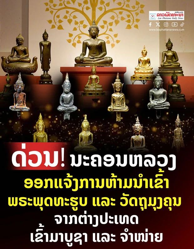 วันที่ 20 สิงหาคม 2567 ที่ผ่านมา แผนกแถลงข่าว วัฒนธรรม และท่องเที่ยว นครหลวงเวียงจันทน์ ได้มีหนังสือแจ้งการถึงผู้ประกอบการจำหน่ายพระพุทธรูป วัตถุมงคลในนครหลวงเวียงจันทน์ เรื่องการห้ามนำเข้าพระพุทธรูปและวัตถุมงคลจากต่างประเทศ เข้ามาบูชาหรือจำหน่ายภายในนครหลวงเวียงจันทน์ มีเนื้อหาโดยสรุปว่า