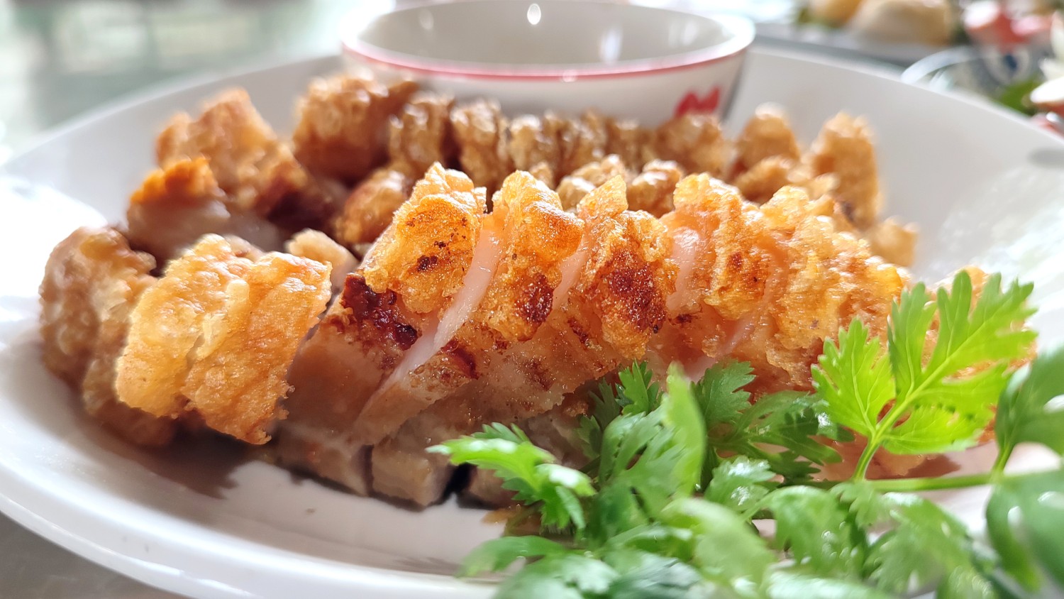 หมูกรอบ กับบรรยากาศทุ่งนาตอนเช้า