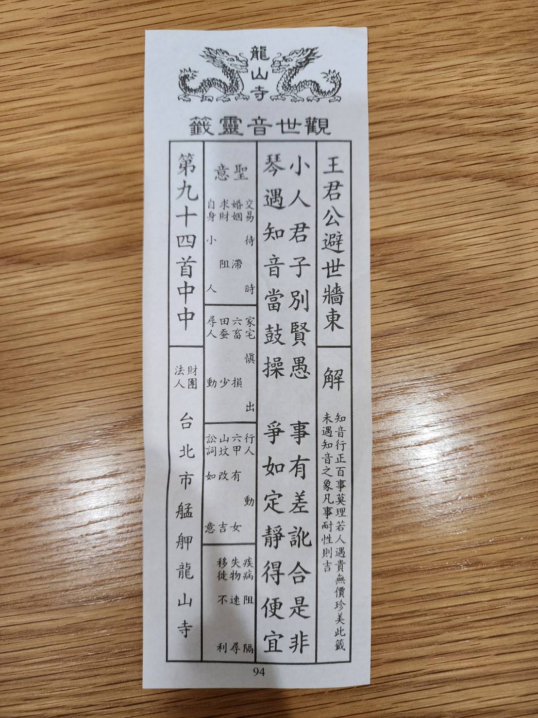 เสี่ยงเซียมซีวัดหลงซานไต้หวันมา อ่านไม่ออกครับ รบกวนช่วยแปลหน่อยครับ ขอบคุณครับ