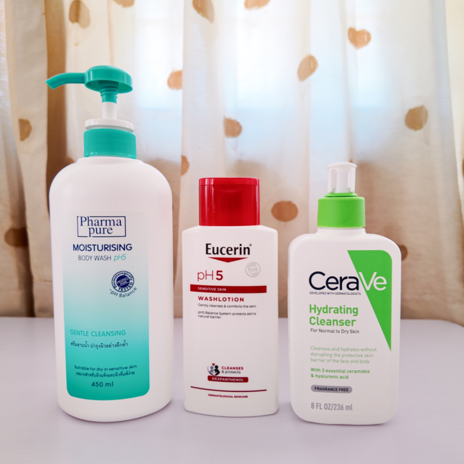 จนได้มาเจอกับ 3 ตัวนี้ค่ะ Eucerin pH5 SENSITIVE SKIN WASHLOTION , PharmaPure Moisturizing Body Wash pH5 , CeraVe Hydrating Cleanser ที่คัดมาแล้วว่าเหมาะสำหรับผิวแพ้ง่าย