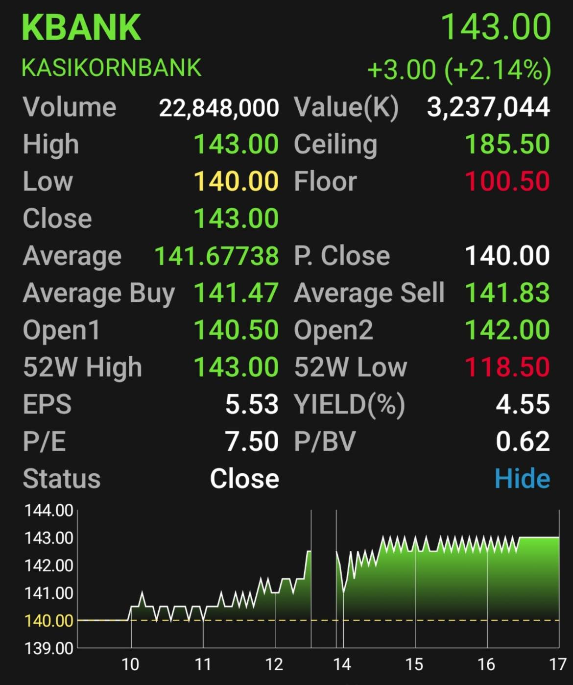 หุ้นKBANKทำNew High ในรอบ1ปีที่ราคา 143 บาท/หุ้น