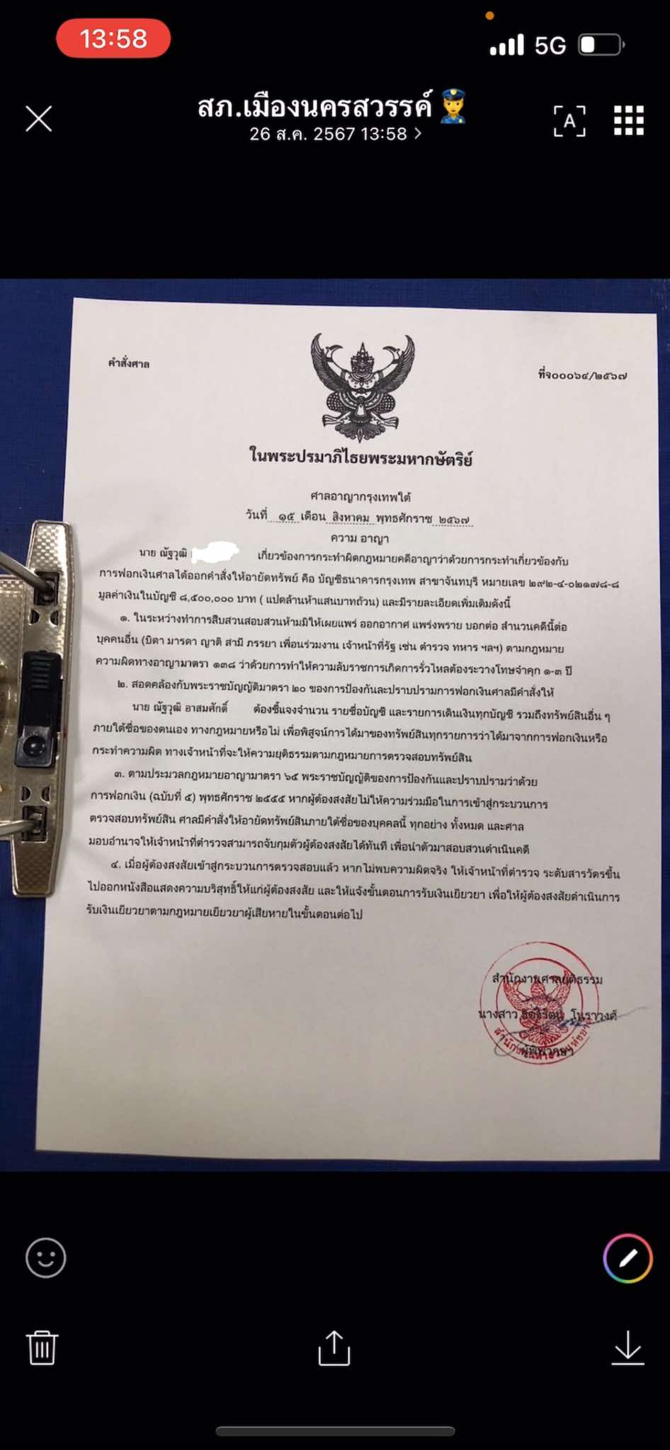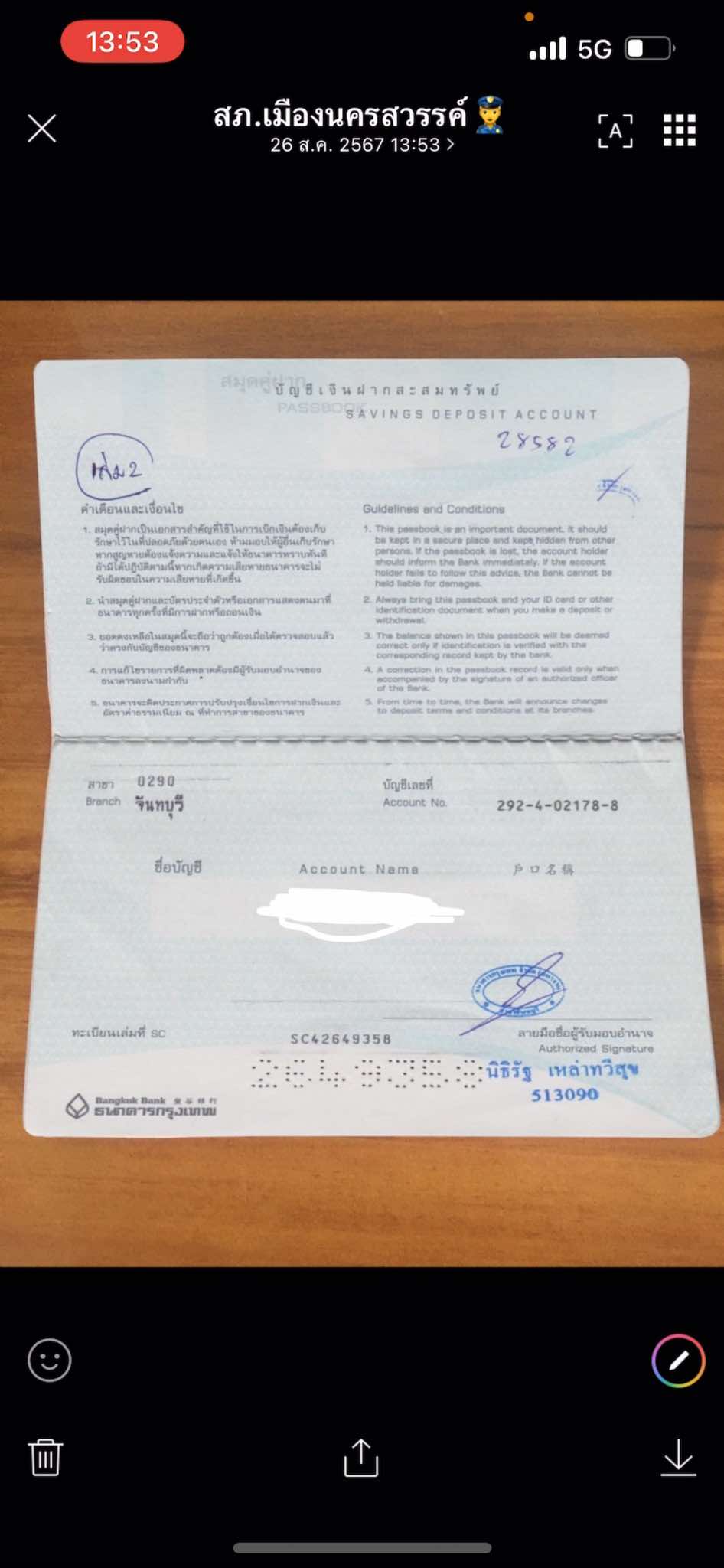 พอสายโอนไปสภ.เมืองนครสวรรค์(มิจฉาชีพ) ก็ทำเป็นพูดว่าแจ้งความออนไลน์ไม่ได้แต่เนื่องจากเราไม่สะดวกมาแจ้งที่สภ.เราขอบันทึกเสียงตลอดสาย ถามที่อยู่จัดส่งเอกสาร ผมก็ได้บอกที่อยู่ปัจจุบันไป(ตอนนี้ก็แอบกังวลว่าไปไหนมาไหนจะโดนทำร้ายร่างกายไหม) ละก็ยาว มีให้คุยในไลน์เพื่อเปิดกล้องยืนยันใบหน้า ทำเป็นส่งข้อมูลให้ฝ่ายนั่นนี่ตรวจสอบ ตรวจสอบไปมาดันมีดีกับคนชื่อธงชัย พันอ้น มันส่งเอกสารราชการปลอม-สมุดบัญชีตัดต่อมาให้ดู เป็นชื่อเรา ตอนสุดท้ายมันถามเบอร์โทร-เลขบัญชีเราแต่ 4 ตัวท้าย (ผมก็ได้บอกไปทุกเบอร์-ทุกบัญชี) แล้วแจ้งยอดเงินที่มีอยู่ มันบอกให้โอนต่อไปเพื่อตรวจสอบเม็ดเงิน ผมได้ลองทำเป็นใส่เลขบัญชีตามมัน ธนาคารกรุงไทย เลขบัญชี 212-0-57058-2 ชื่อ ธนรัฐ สุขโอ้ แต่ไม่ได็กดโอนแค่ดูชื่อแล้วผมก็ได้กดวางสายแล้วบล็อค