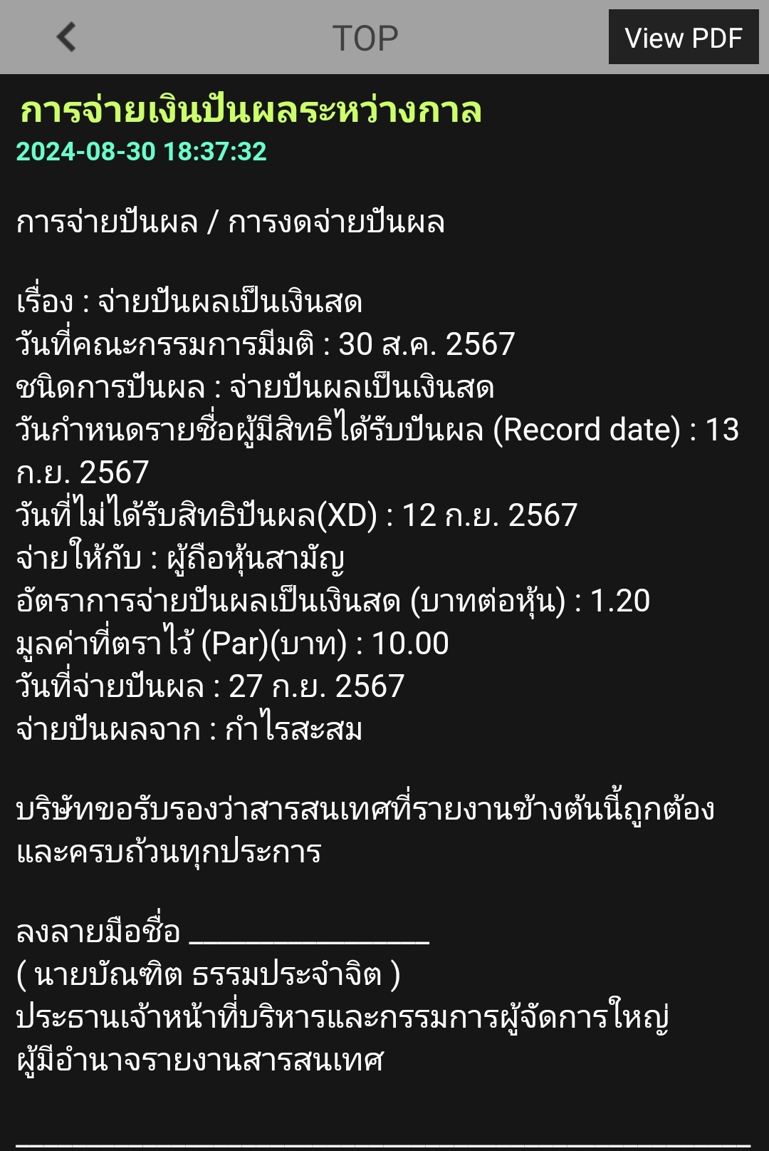 จ่ายปันผล วันที่ว 27 กันยายน 2567