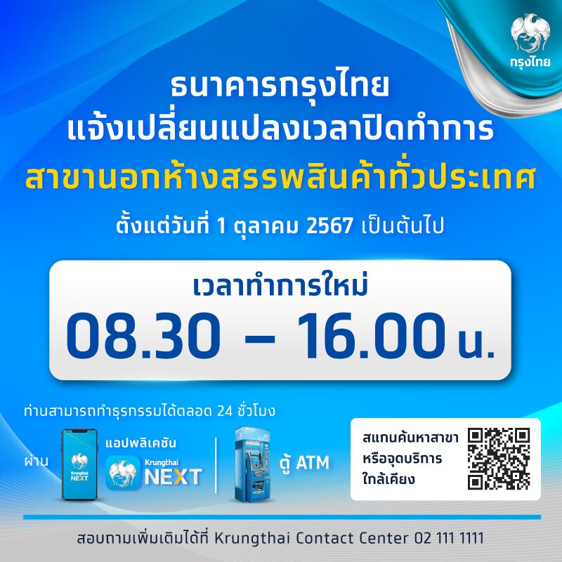 ธนาคารกรุงไทยปรับเวลาทำการสาขานอกห้างสรรพสินค้า ปิดทำการเร็วขึ้นเป็น 16.00 น. ตั้งแต่ 1 ตุลาคม 2567 เป็นต้นไป