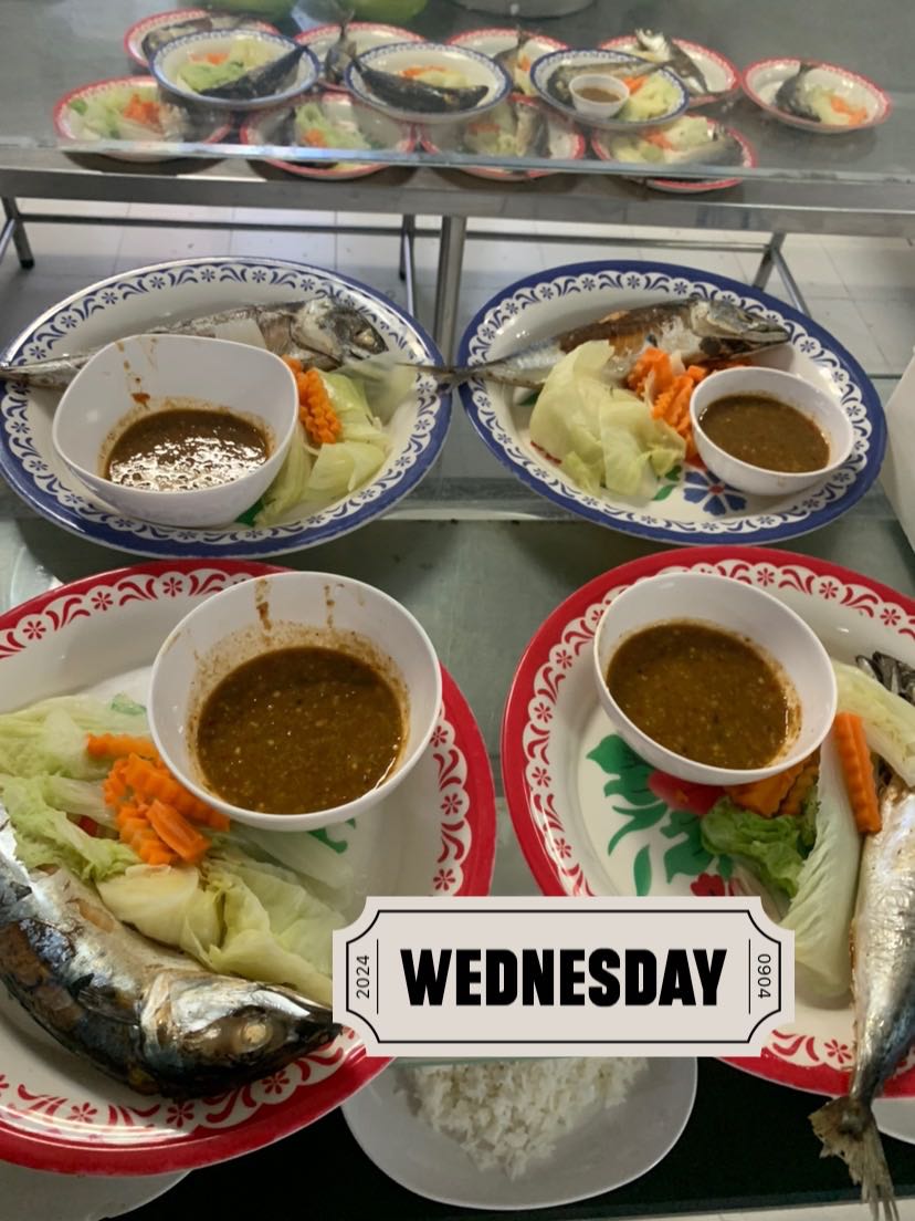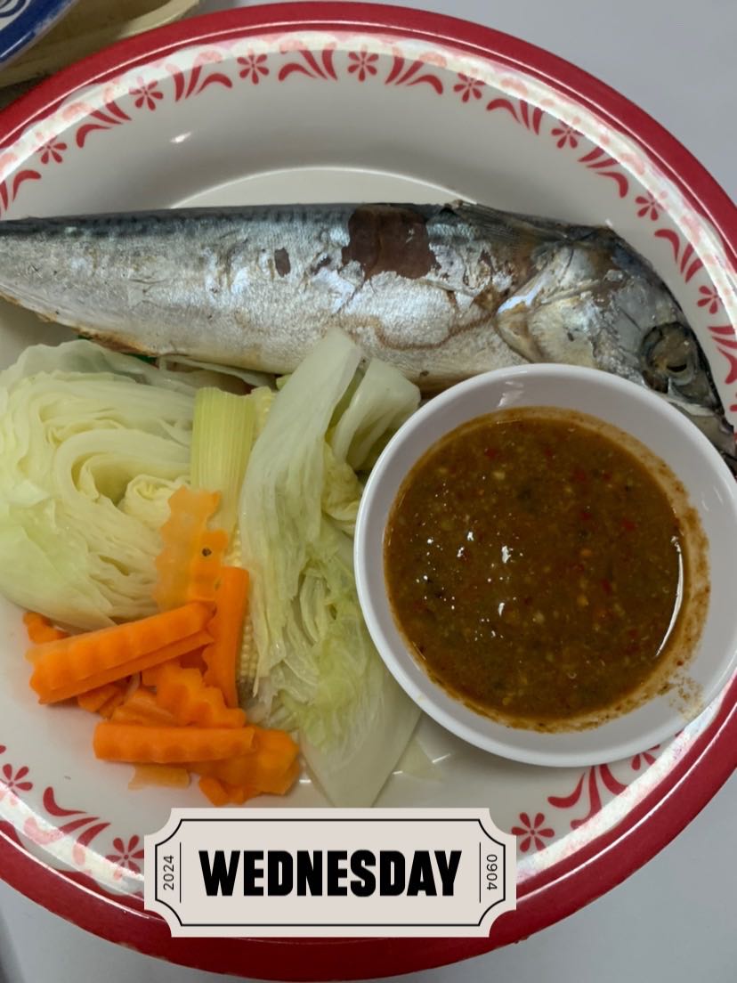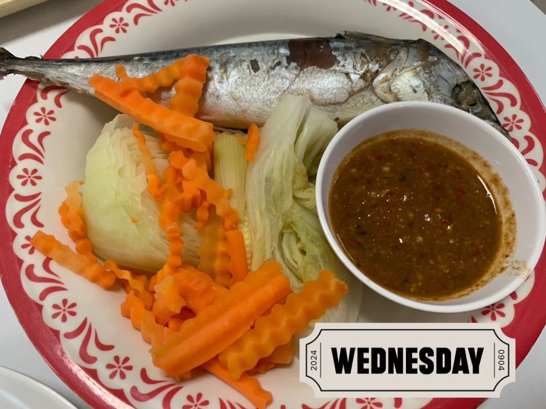 อาหารเที่ยงฟรีบริษัท: ปลาซาบะนึ่ง & ผักนึ่ง & ป่นร้า