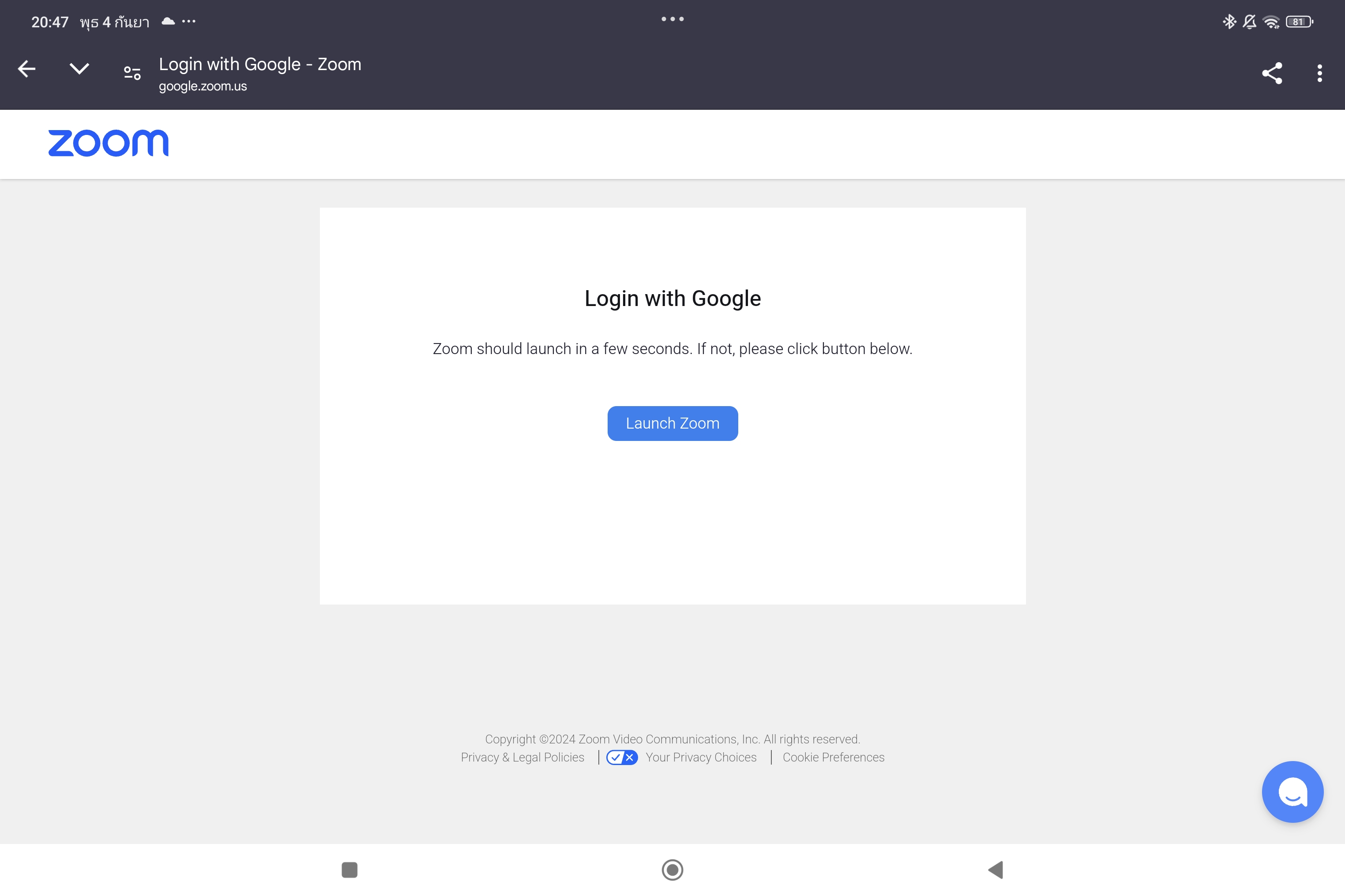 กด Launch Zoom เเล้วยังอยู่ที่เดิมไม่ได้เข้าสู่ระบบ เเล้วค้างอยู้หน้าจอนี้ครับ