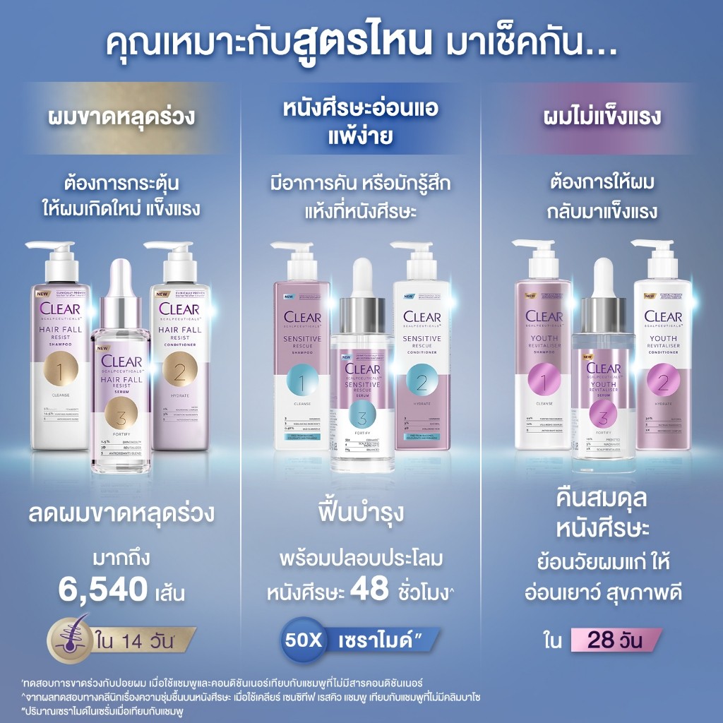 CLEAR แชมพู สูตรลดผมร่วง ช่วยแก้ปัญหาผมขาดหลุดร่วงได้ตรงจุด ด้วยเทคโนโลยี Follilock ที่ช่วยยึดเกาะรากผมให้แข็งแรง ผสานวิตามินบำรุงหนังศีรษะและเส้นผม เมื่อใช้คู่กับคอนดิชันเนอร์และเซรั่ม จะช่วยให้ผมแข็งแรงขึ้น ลดผมขาดร่วง และเพิ่มวอลลุ่มให้เส้นผม ดูหนาขึ้น เห็นผลจริงใน 14 วัน สูตรอ่อนโยน ไม่ระคายเคืองหนังศีรษะ เหมาะสำหรับผู้ที่มีปัญหาผมร่วง ผมบาง