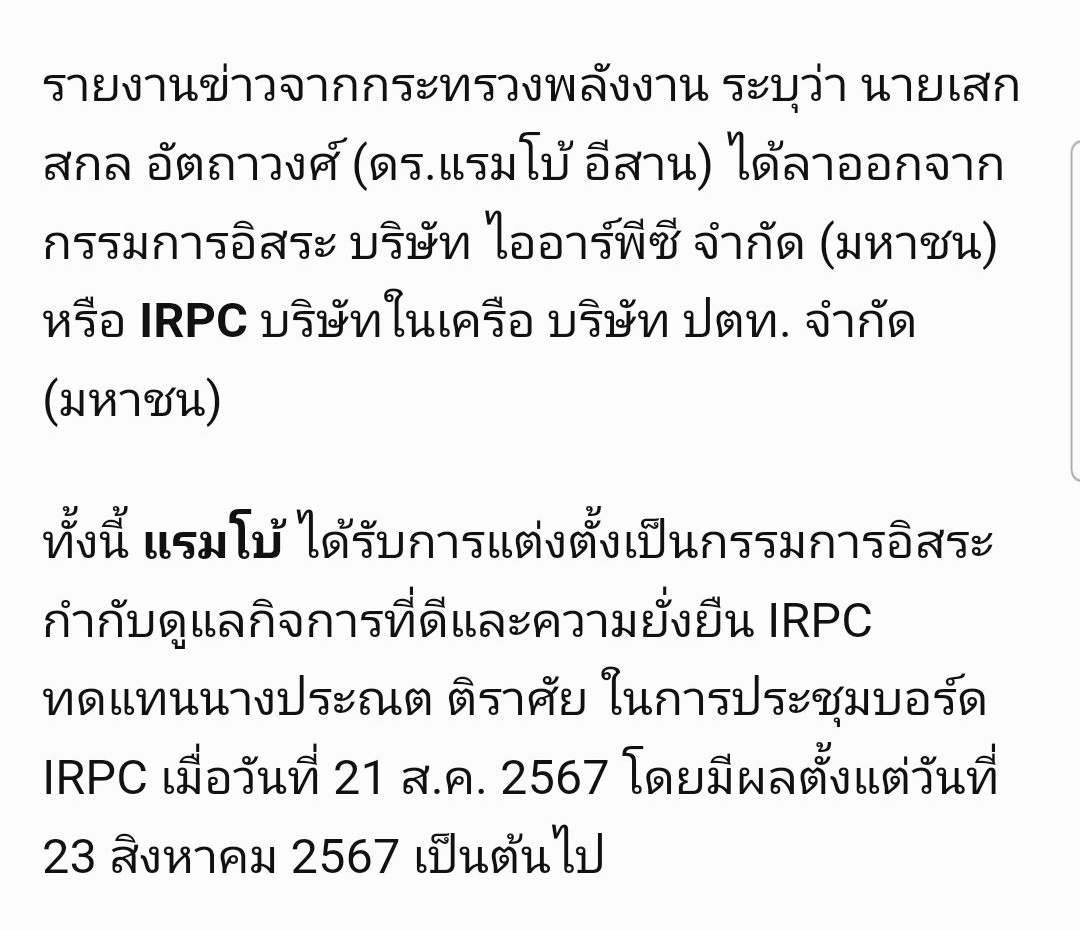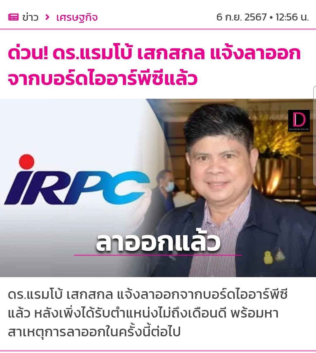 ด่วน! ดร.แรมโบ้ เสกสกล แจ้งลาออกจากบอร์ดไออาร์พีซีแล้ว ... สามารถติดตามต่อได้ที่ : https://www.dailynews.co.th/news/3833373/