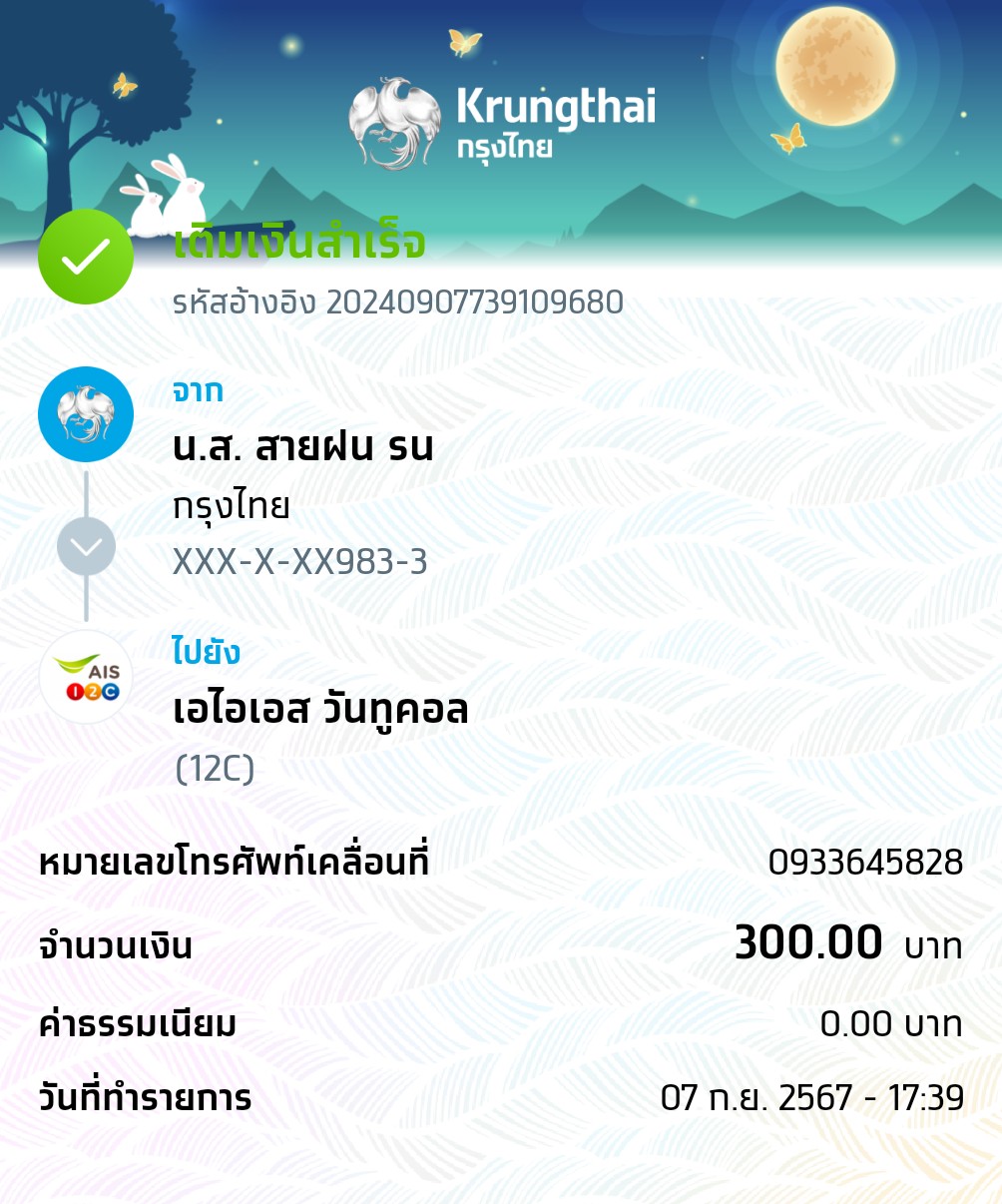 สวัสดีค่ะais โอนเงินผิดเบอร์กับแอพktbไปยังเบอร์0933645828 เป็นเงิน 300 บาท รบกวนดึงกลับมายังเบอร์ 0933645820 ขอบคุณค่ะ