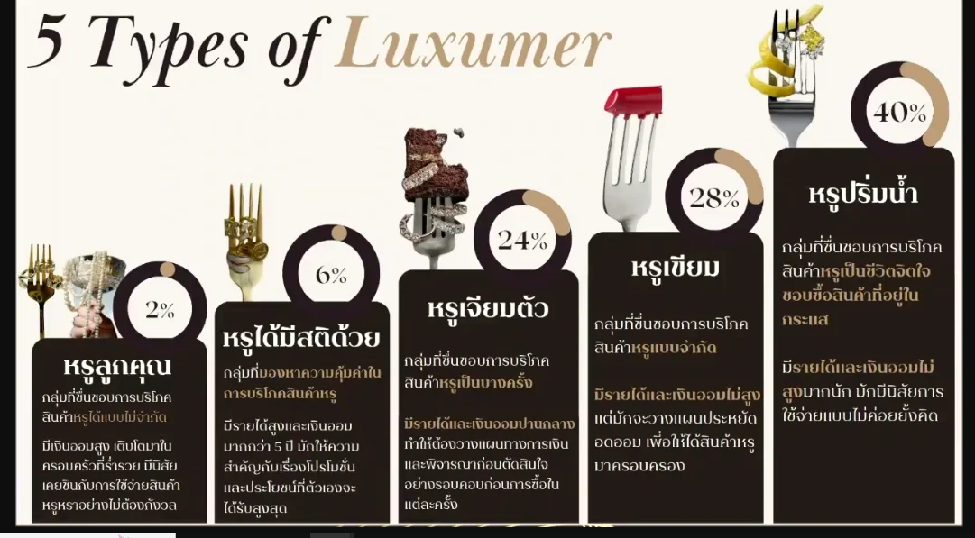 กลุ่มสุดท้ายคือ ‘หรูลูกคุณ’ เป็นกลุ่มที่ชื่นชอบการบริโภคสินค้าหรูได้แบบ ไม่จำกัด มีเงินออมสูง เติบโตมาในครอบครัวที่มีฐานะร่ำรวย สามารถใช้จ่ายสินค้าหรูหราได้อย่างไม่ต้องกังวล