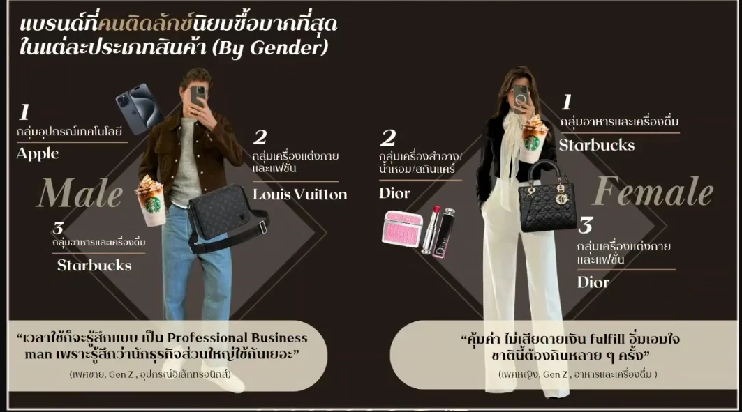 แบรนด์โปรดสุดหรูสำหรับหญิงและชาย คือ Apple (กลุ่มอุปกรณ์เทคโนโลยี), Louis Vuitton (กลุ่มเครื่องแต่งกาย และแฟชั่น) และ Starbucks (กลุ่มอาหาร และเครื่องดื่ม) สำหรับผู้ชาย ส่วนฝั่งผู้หญิงนั้นเทใจให้กับ Starbucks (กลุ่มอาหาร และเครื่องดื่ม), Dior (กลุ่มเครื่องสำอาง/น้ำหอม/สกินแคร์) และ Dior (กลุ่มเครื่องแต่งกาย และแฟชั่น)