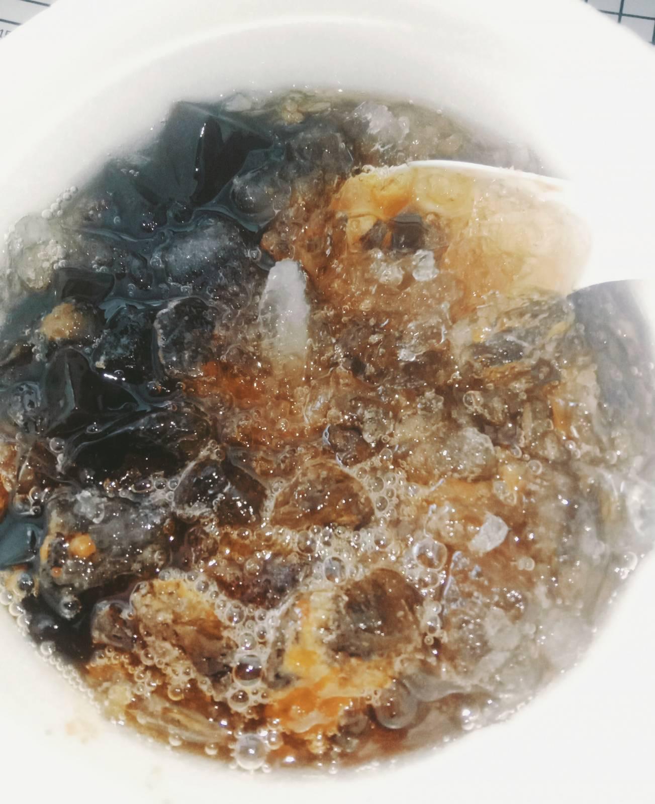 เห็นคนอื่นกินได้เลยลองกินบ้าง สุดท้ายเราตักกินแต่เนื้อเฉาก๊วย เพราะน้ำออกหวานมากไปหน่อยกลืนไม่ลง