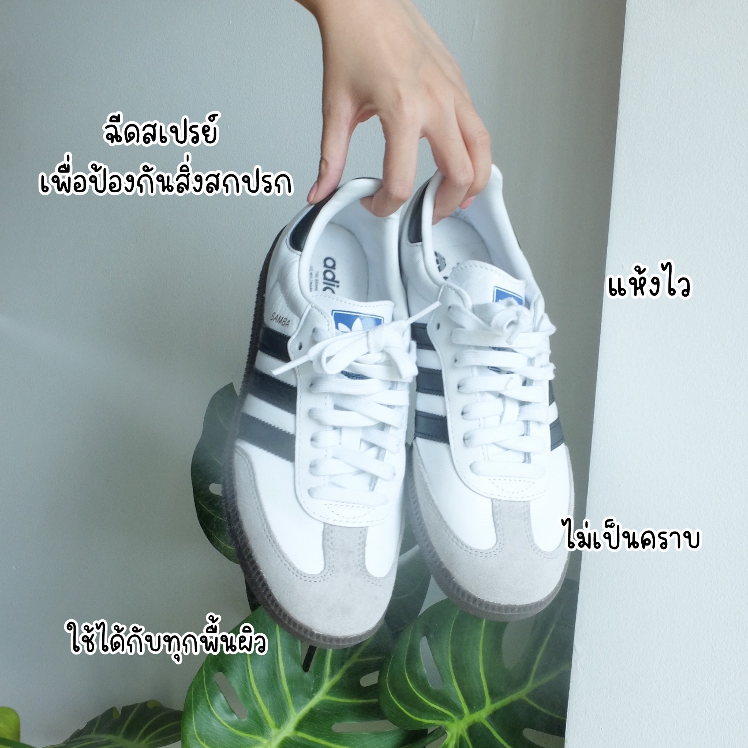 วิธีใช้ง่ายๆเลยเราจะฉีดสเปรย์ลงไปตรงรองเท้า และยิ่งรองเท้ารุ่นนี้มีตัวหนังกลับ ซึ่งคนรักรองเท้าจะรู้ดีว่า ถ้าเอาไปลุยน้ำ รองเท้าคือเละแน่ พวกคราบและสิ่งสกปรกฝังแน่นตรงตัวหนังกลับแน่นอน เมื่อเราฉีดทิ้งไว้ให้แห้งซักแป๊บนึง ก็สามารถใช้งานได้เลย วัสดุที่ใช้ได้