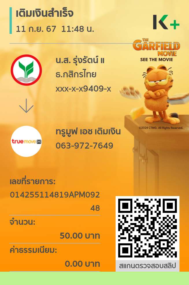 เติมเงินทรูไม่เข้า เติมผ่านแอพกสิกร เบอร์0840970295
