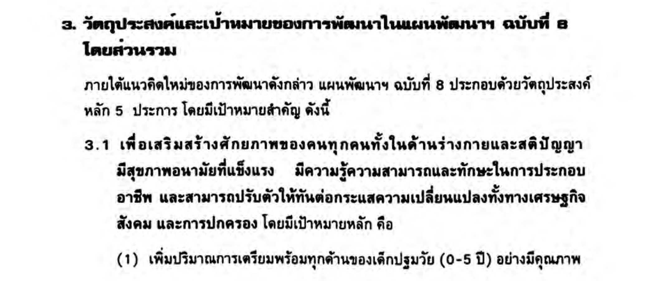 อ้างอิงแผนพัฒนาเศรษฐกิจและสังคมแห่งชาติ ฉบับที่ 8 หน้า ขอไข่ การอภิวัฒน์การศึกษาไทย 2538 ตามแผนแม่บทนโยบายปฏิรูปการศึกษายุคโลกาภิวัตน์2538: เพื่อเตรียมพร้อมพลเมืองไทยสำหรับศตวรรษที่ 21 โดยใช้แผนพัฒนาเ