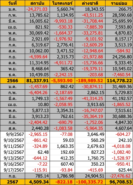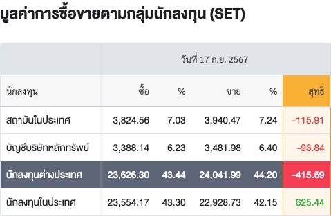 Sinthorn Summary 17/9/2567 : ต่างชาติขายสุทธิ -415.69 ลบ.