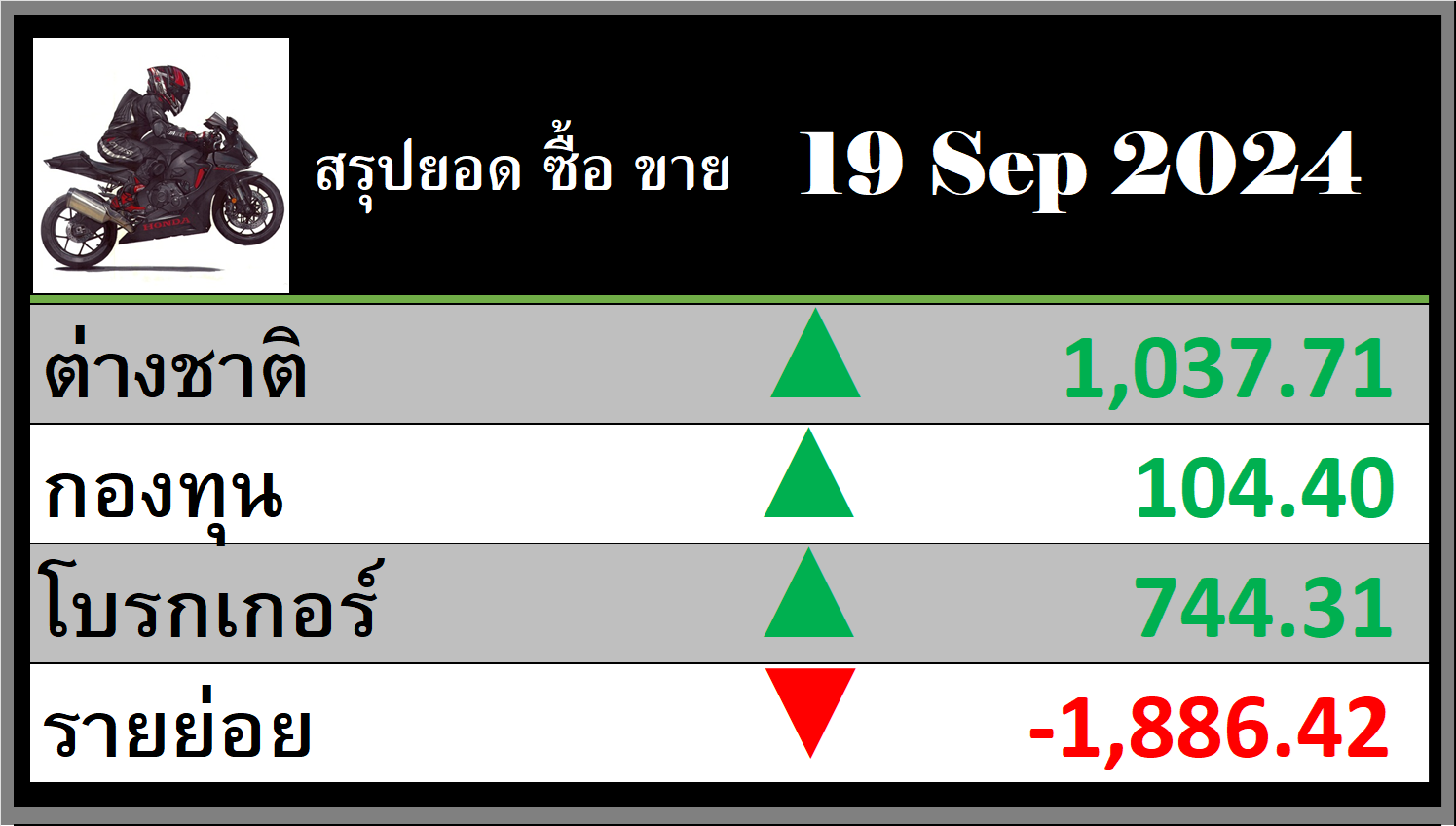 19 ก.ย. 2567 ต่างชาติ ซื้อต่อ 🟢1,037.71 ล้าน