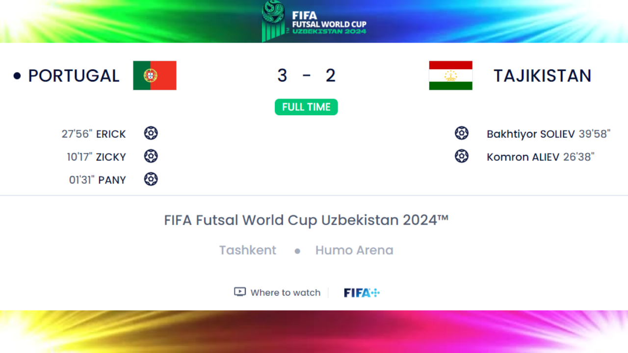 ทีมชาติโปรตุเกส (อันดับ 2 ของโลก) (แชมป์เก่า) -เอาชนะ- ทีมชาติทาจิกิสถาน (อันดับ 34 ของโลก) - 3 ประตูต่อ 2,