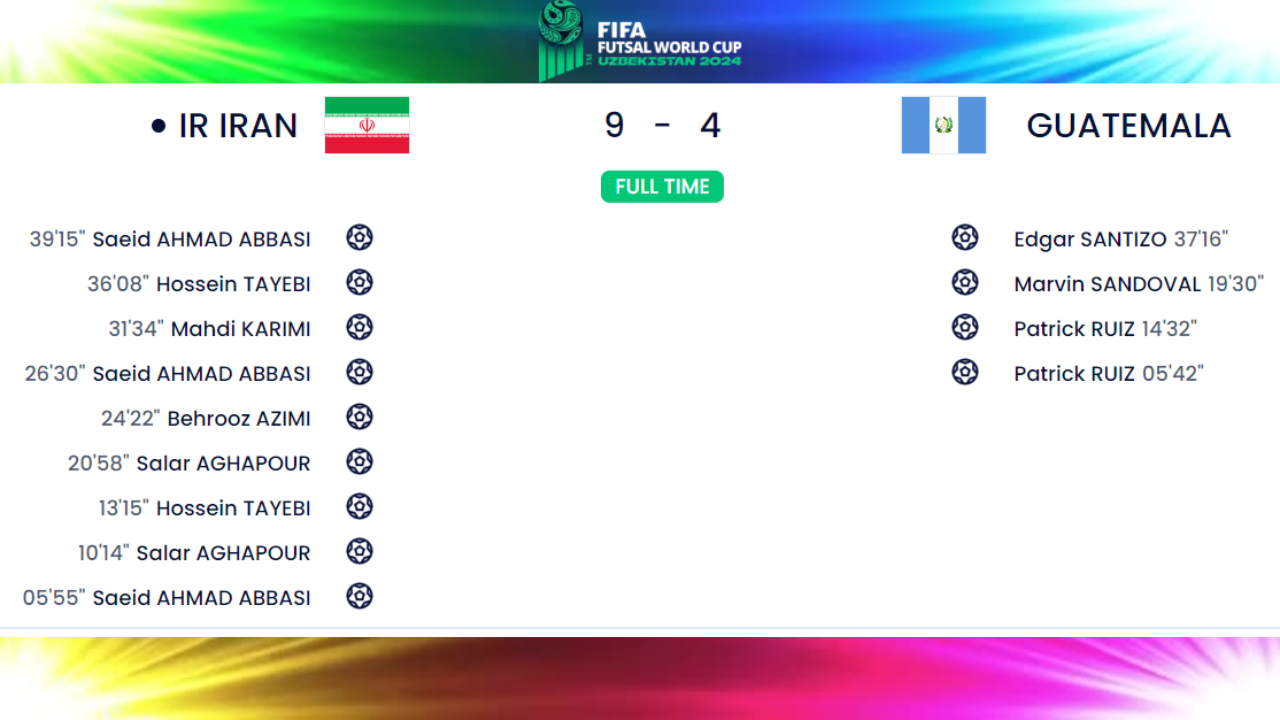 ทีมชาติอิหร่าน (อันดับ 4 ของโลก) -เอาชนะ- ทีมชาติกัวเตมาลา (อันดับ 40 ของโลก) - 9 ประตูต่อ 4,