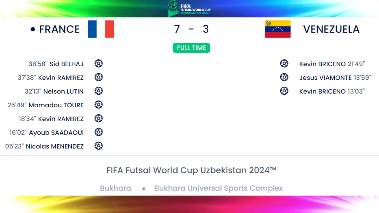 ทีมชาติฝรั่งเศส (อันดับ 10 ของโลก) -เอาชนะ- ทีมชาติโบลีวาร์เวเนซุเอลา (อันดับ 21 ของโลก) - 7 ประตูต่อ 3,