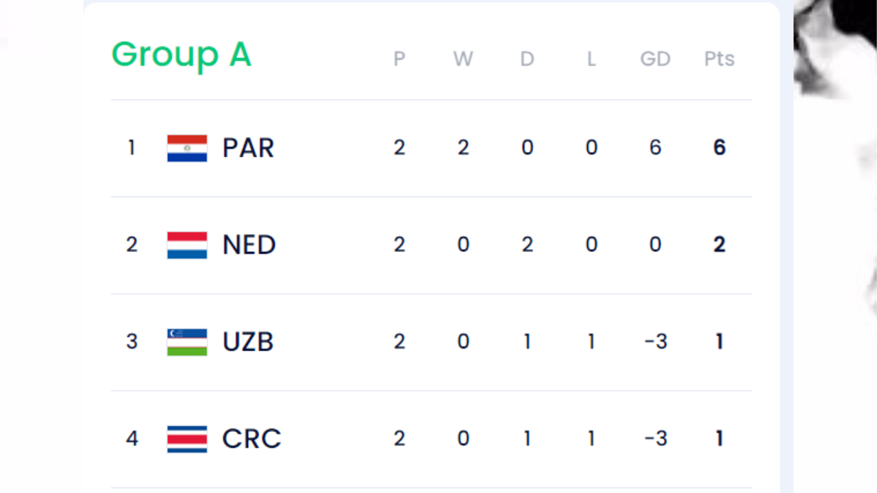 อันดับ1, ทีมชาติปารากวัย (อันดับ 13 ของโลก) / แข่ง 2 / ชนะ 2 / เสมอ 0 / แพ้ 0 / +6 ประตู / มี 6 คะแนน -ผ่านเข้ารอบ 16ทีมสุดท้ายแน่นอนแล้ว