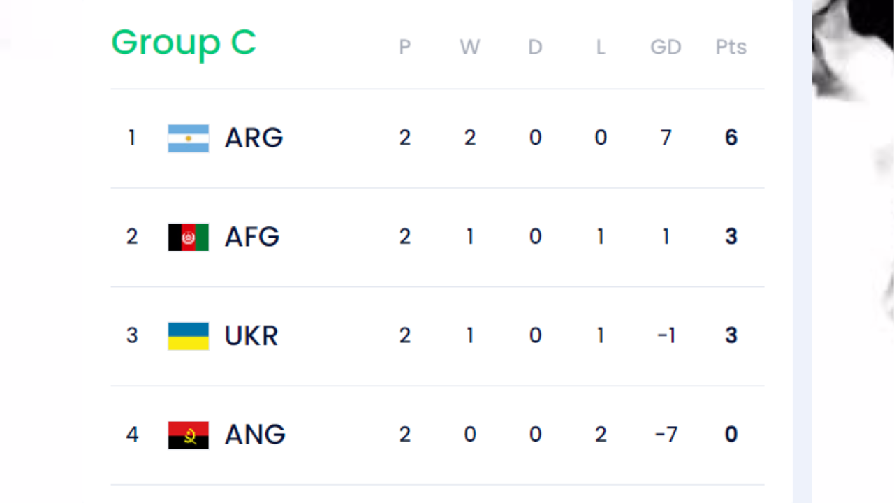 อันดับ1, ทีมชาติอาร์เจนตินา (อันดับ 5 ของโลก) / แข่ง 2 / ชนะ 2 / เสมอ 0 / แพ้ 0 / +7 ประตู / มี 6 คะแนน -ผ่านเข้ารอบ 16ทีมสุดท้ายแน่นอนแล้ว