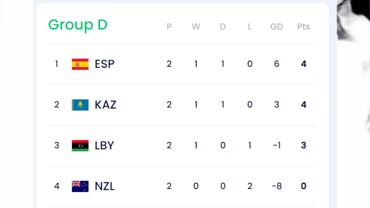 อันดับ1, ทีมชาติสเปน (อันดับ 3 ของโลก) / แข่ง 2 / ชนะ 1 / เสมอ 1 / แพ้ 0 / +6 ประตู / มี 4 คะแนน
