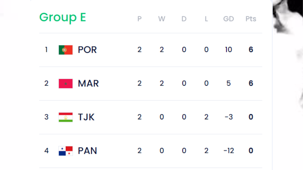 อันดับ1, ทีมชาติโปรตุเกส (อันดับ 2 ของโลก) (แชมป์เก่า) / แข่ง 2 / ชนะ 2 / เสมอ 0 / แพ้ 0 / +10 ประตู / มี 6 คะแนน -ผ่านเข้ารอบ 16ทีมสุดท้ายแน่นอนแล้ว