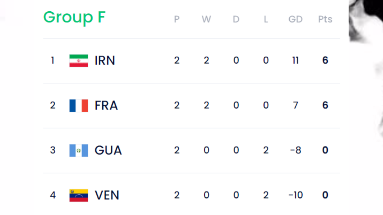 อันดับ1, ทีมชาติอิหร่าน (อันดับ 4 ของโลก) / แข่ง 2 / ชนะ 2 / เสมอ 0 / แพ้ 0 / +11 ประตู / มี 6 คะแนน -ผ่านเข้ารอบ 16ทีมสุดท้ายแน่นอนแล้ว