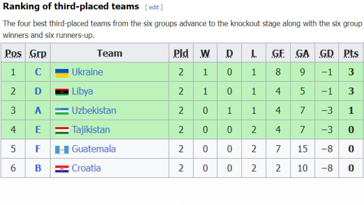 อัปเดตตารางคะแนนในรอบแบ่งกลุ่มหรือรอบแรก โดยในรอบนี้จะแบ่งออกเป็นทั้งหมด 6กลุ่ม กลุ่มละ 4ทีม จะคัดเลือกเอาอันดับ1 และ2 ของแต่ละกลุ่มผ่านเข้าสู่รอบน็อคเอาท์ พร้อมด้วยทีมอันดับ3 ที่ดีที่สุดอีก 4ทีม