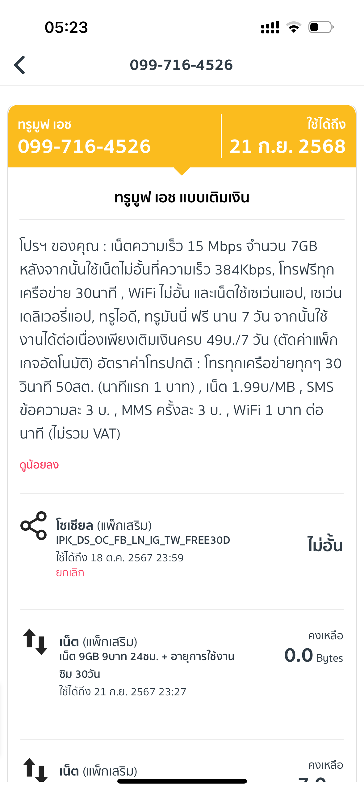 ช่วยยกเลิก ให้ด้วยค่ะ เติมเงินมาทีไร มันหักเงินตลอดเลย ช่วยยกเลิก เนต 6Mbps 1วัน 32บาท ให้ด้วยค่ะ 0960701554 truemove truemove H
