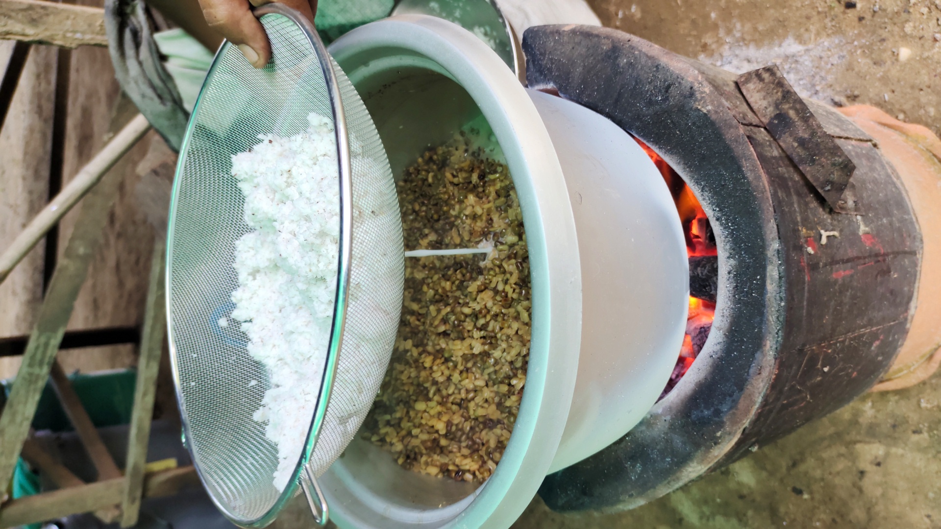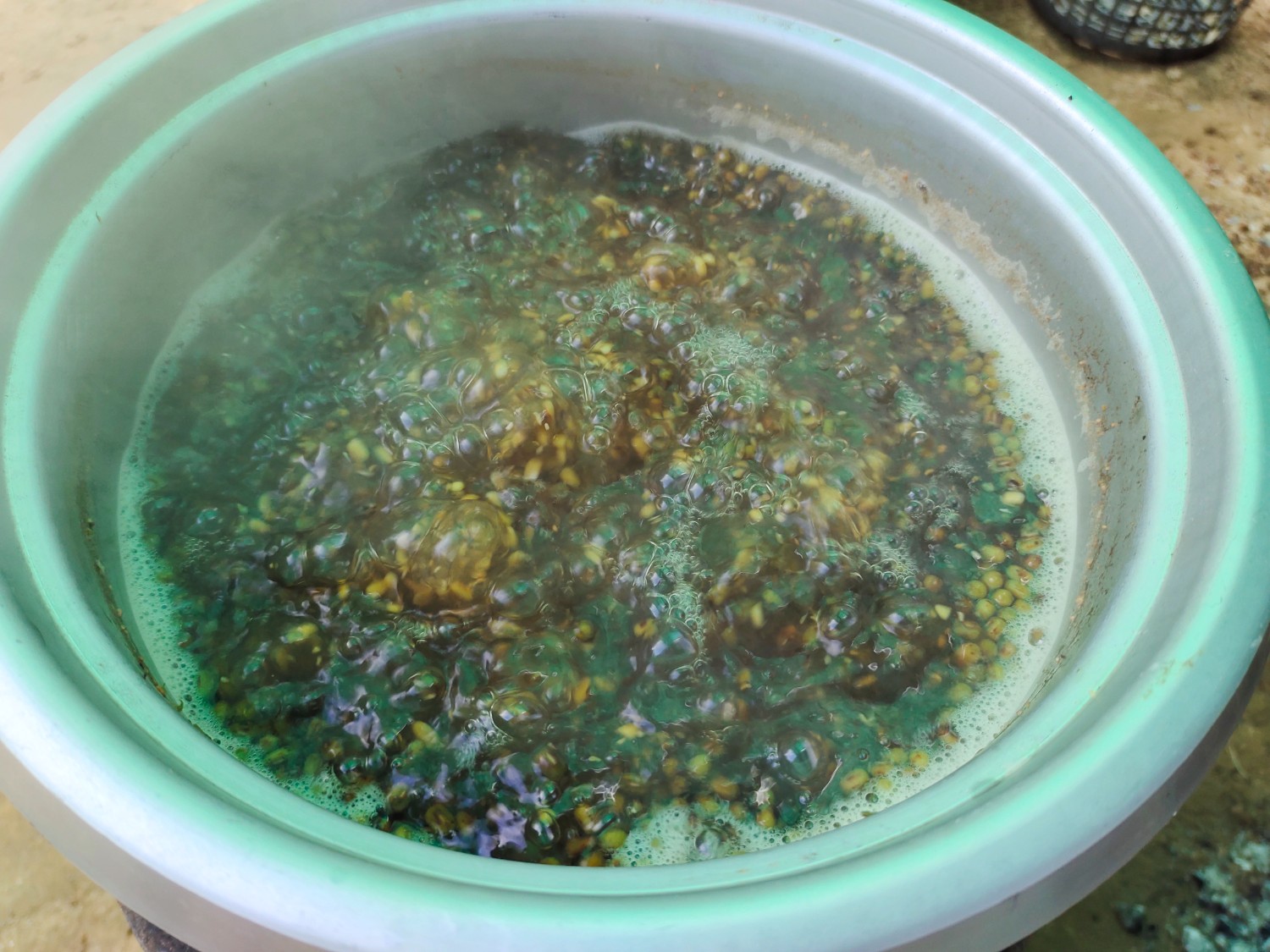 3. ตั้งหม้อต้มน้ำ (ใช้เตาถ่าน) ใส่ถั่วเขียวลงไปต้มจนน้ำเดือด แล้วเทน้ำทิ้งออกไปครึ่งนึง ต้มไปอีกสักพัก 5-10 นาที